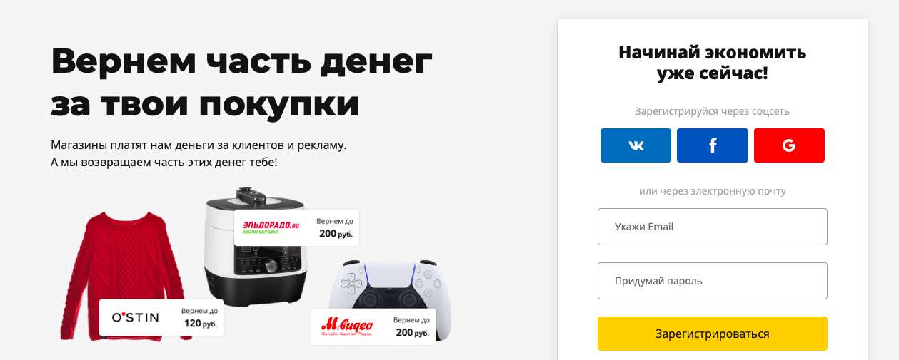 Этот ресурс не так популярен. Его не рекламировали топовые блогеры, но на нем тоже есть чем разжиться. Да и вообще, два кешбэк-сервиса лучше одного. Регистрируйтесь и выбирайте наиболее выгодные предложения на обеих площадках.