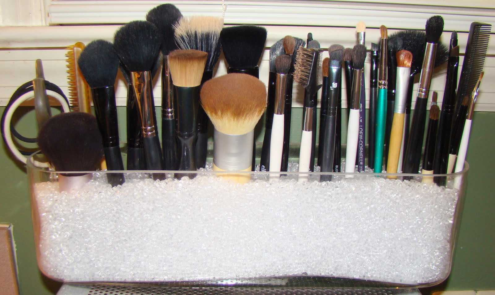 Чтобы продлить срок службы кистей для макияжа, храните их строго в вертикальном положении. Для этого можно взять любой глубокий контейнер и заполнить его пенопластовыми гранулами, которые можно купить в строительных магазинах, или просто рисом. Вставьте в наполнитель все ваши кисти и больше не волнуйтесь о том, что какая-либо из них затеряется или испачкает стол.