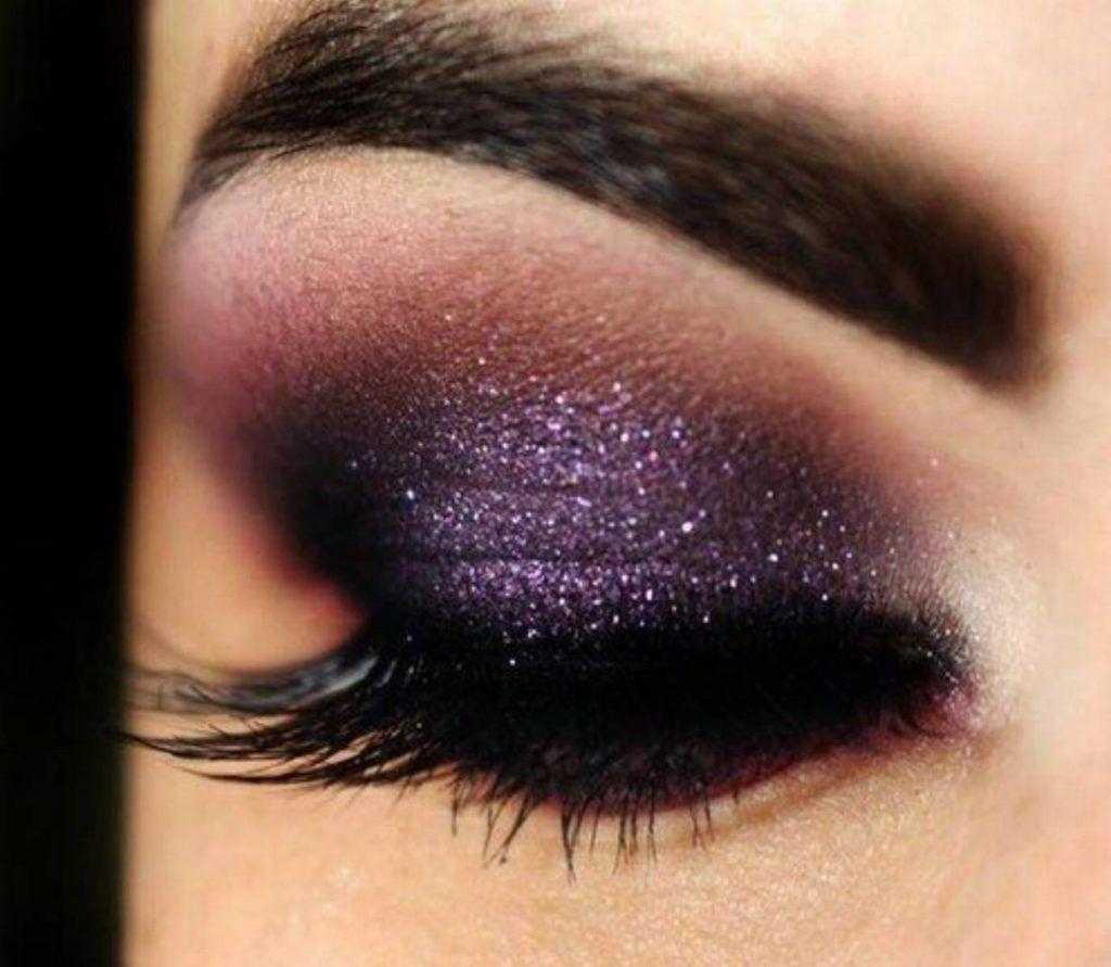 В зависимости от интенсивности теней и наличия накладных ресниц такой макияж может получиться как дневным, так и вечерним. Насыщенный фиолетовый пигмент с добавлением блёсток отлично подойдёт для новогодней ночи.