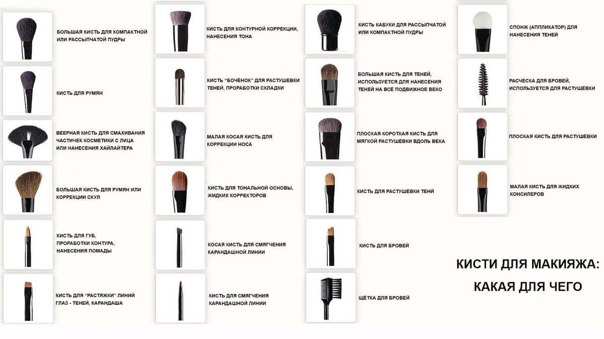 | 4 | Кисточки для макияжа глаз. | Разновидностей много. Крупные, плотные натуральные, с круглыми кончиками используются для нанесения теней на всю поверхность века, либо для нанесения базы под тени. Тонкие, с длинным ворсом и мягкие и короткие применяют для нанесения теней в складки века, изменения формы глаза. Плоские, твердые с ровными и скошенными краями, искусственные и натуральные удобны для работы с жидкими или кремовыми тенями. Небольшие, плоские, или короткие и толстенькие подходят для работы в уголках глаз, создания контура. |