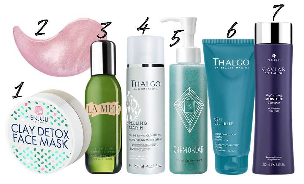 1 — глиняная детокс-маска для лица на основе морских водорослей и зеленого чая Enjoli, 2 — гидрогелевые патчи с экстрактом ламинарии Mixit, 3 — ревитализирующая увлажняющая сыворотка с водорослями La Mer, 4 — интенсивная обновляющая эссенция с эффектом пилинга Peeling Marin от Thalgo, 5 — гель для умывания с морскими водорослями Cremolab, 6 — интенсивный корректирующий крем против целлюлита Thalgo, 7 — шампунь-биоревитализация для увлажнения с морским шелком Alterna