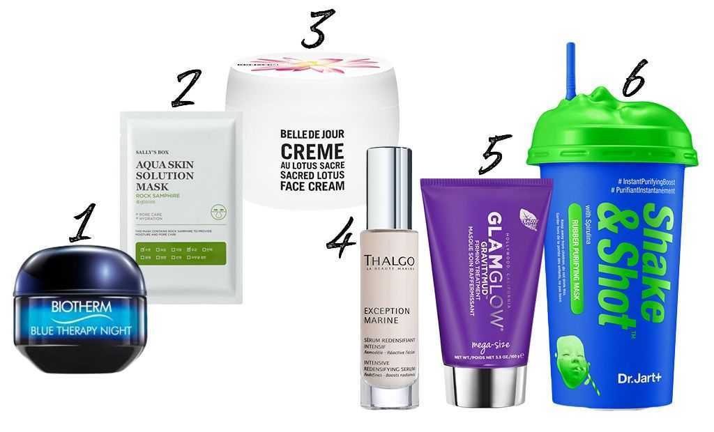 1 — ночной крем для лица с ламинарией Biotherm, 2 — тканевая маска для сужения пор лица с морским фенхелем Sally’x Box, 3 — крем для лица Belle de Jour с экстарктом коричневой морской водоросли Kenzoki, 4 — интенсивный укрепляющий антивозрастной крем для лица с экстрактом красной морской водоросли Ирландский мох Thalgo, 5 — маска для лица повышающая упругость кожи с экстарктом исландских бурых водорослей Glamglow, 6 — антиоксидантная альгинатная детокс-маска для лица со спирулиной Dr.Jart