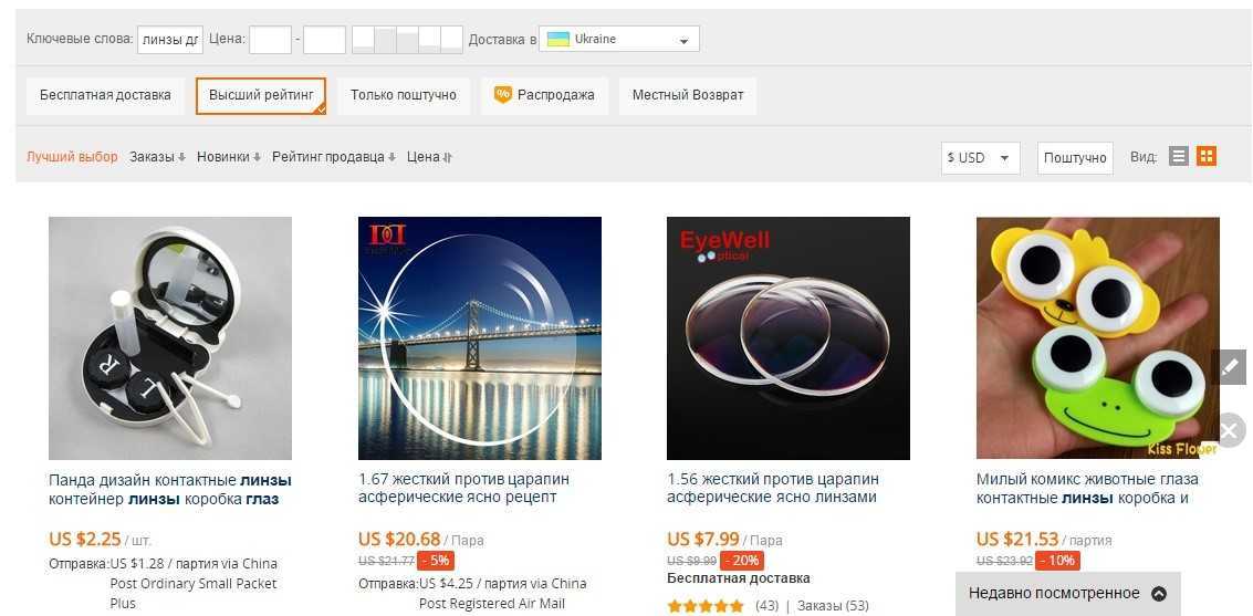 Как видите, товаров, имеющих косвенное отношение к оптике, довольно много. Это поляризованные линзы для очков, наборы для хранения мягких контактных линз, но искомого нет. Даже если пролистать каталог до конца, кропотливый поиск вряд ли даст положительные результаты.