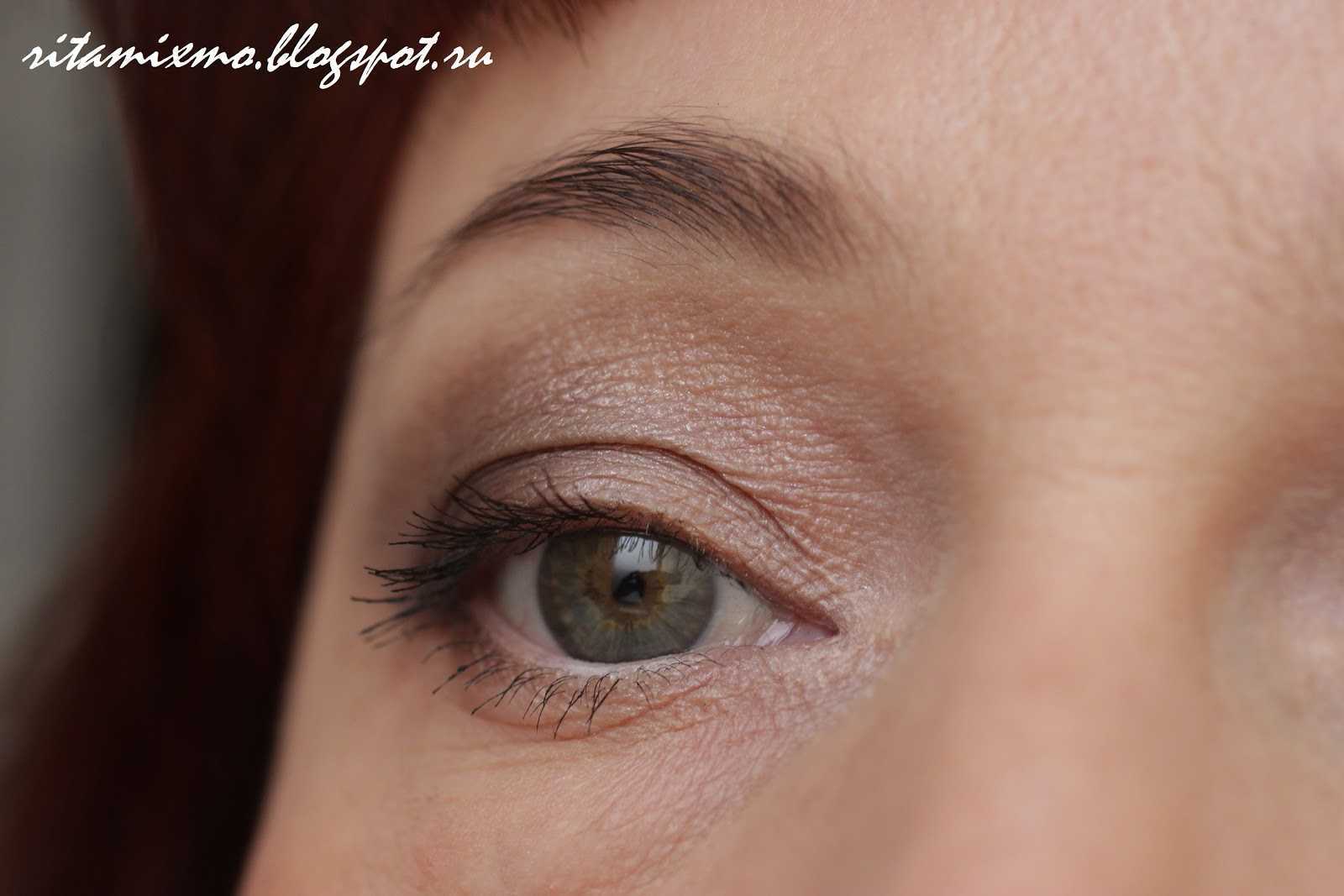 Второй оттенок — телесный, с почти матовым финишем. Почему почти? Если внимательно приглядеться, то тени содержит светоотражающие частички, их немного, но они есть. Это позволяет теням не выглядеть меловыми. Их законное место на подвижном веке, а еще это самые активные участники для растушевки.