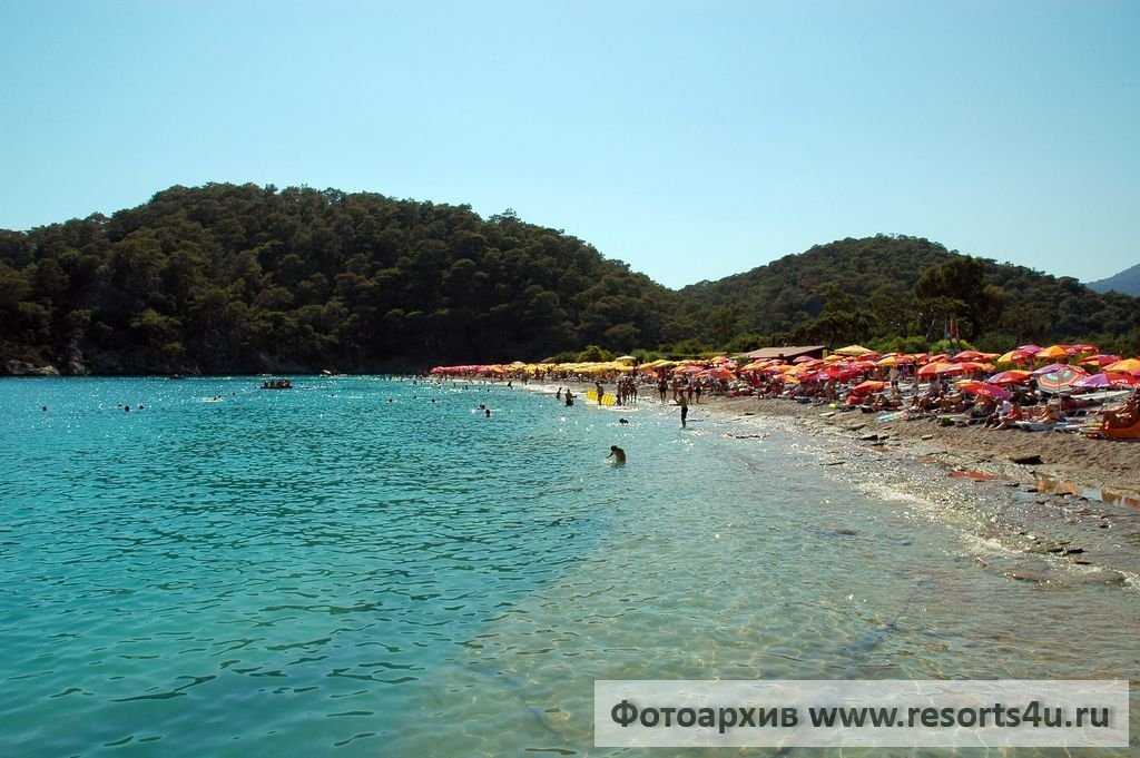 Вид на пляж Голубой лагуны является визитной карточкой Олюдениз, именно он растиражирован на многочисленных рекламных буклетах Турции.