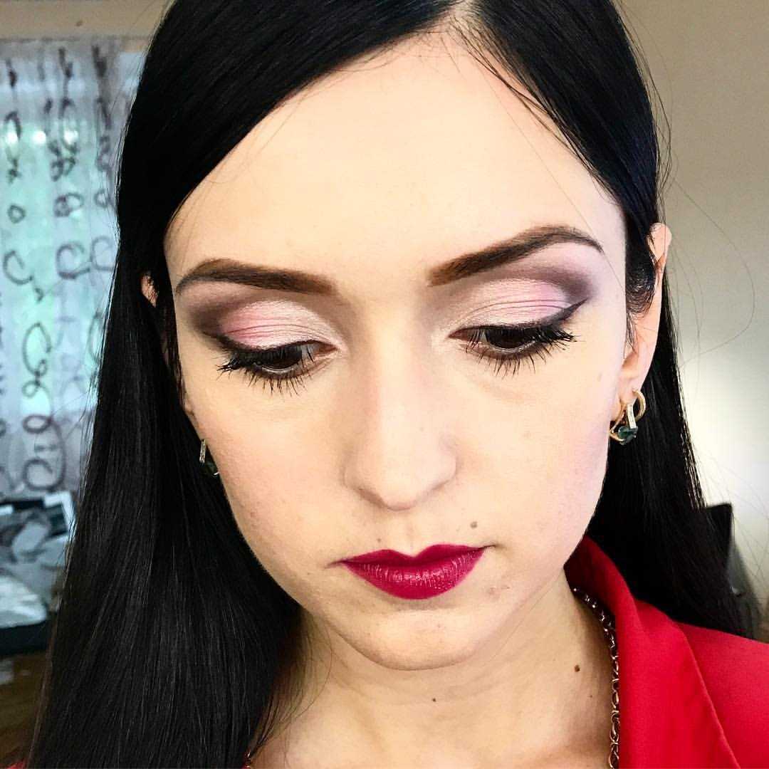 - Тени чистого красного цвета — на любителя. Универсальные варианты — с красно-коричневым или розовым подоном. Кстати, прекрасно оттеняет глаза и алая помада – красный на губах визуально «выведет» зеленый аспект болотного цвета на передний план (кстати, о том, как сделать макияж одной только помадой, мы рассказывали здесь ).
