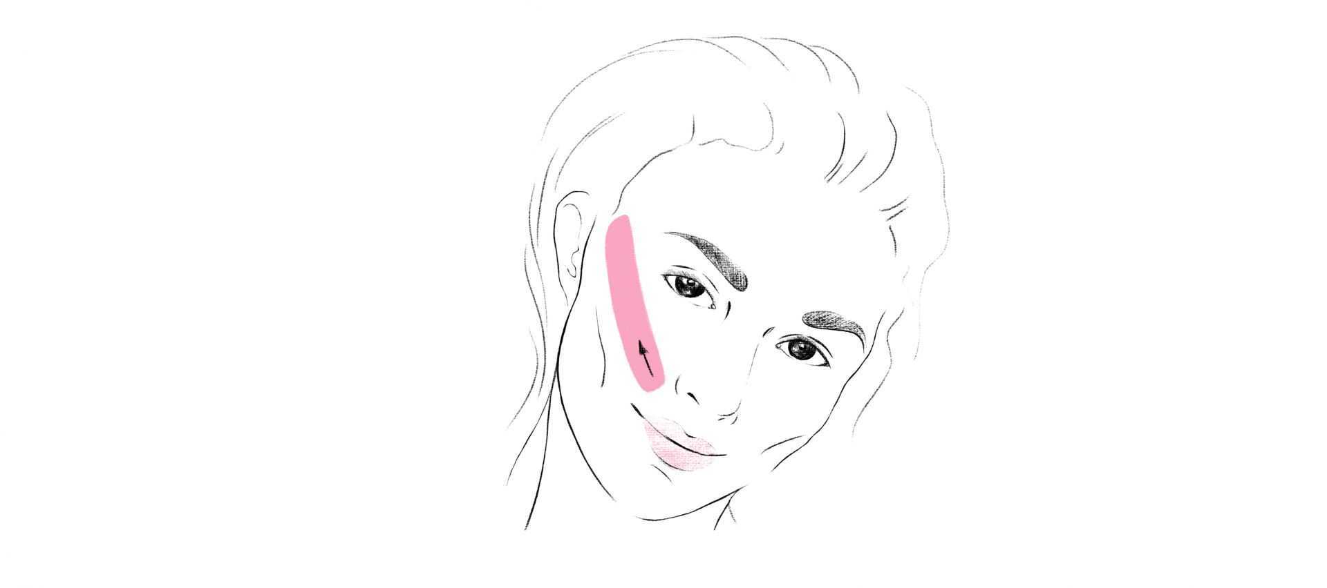 Для этого вам понадобится длинный тейп, примерно 10–15 см. Подтяните вверх пальцами кожу у висков и зафиксируйте в этой точке тейп вдоль скуловых мышц.