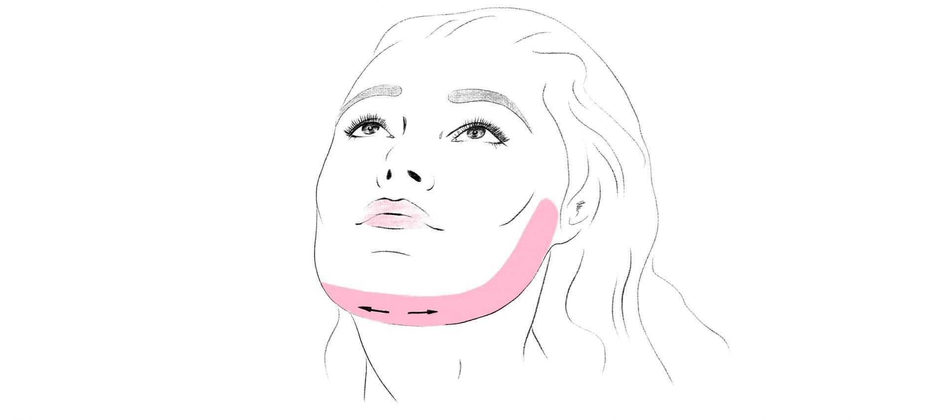 Для этого понадобится тейп шириной примерно 2,5 см и длиной примерно 20–25 см – в зависимости от индивидуальных особенностей (для этого измерьте расстояние от одного уха до другого под подбородком). Тейп клеится по контуру лица – в направлении от середины от подбородка к ушам. Около ушей слегка подтяните кожу вверх рукой при наклеивании. Также при наклеивании проследите, чтобы под тейпом кожа была расправлена, без заломов и морщин.