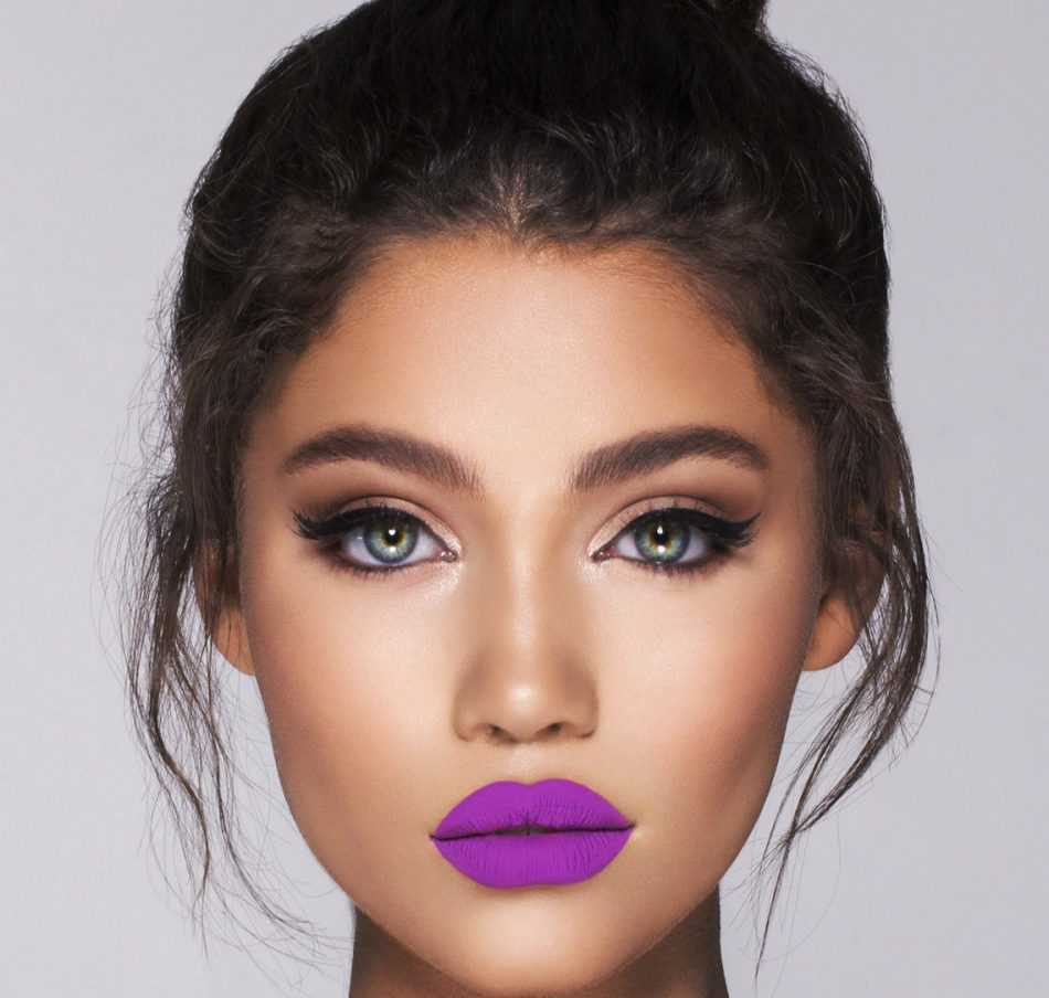 Если девушка хочет остановить свой выбор на фиолетовой губной помаде, не следует делать в макияже дополнительный акцент на глазах, чтобы не перегрузить образ.