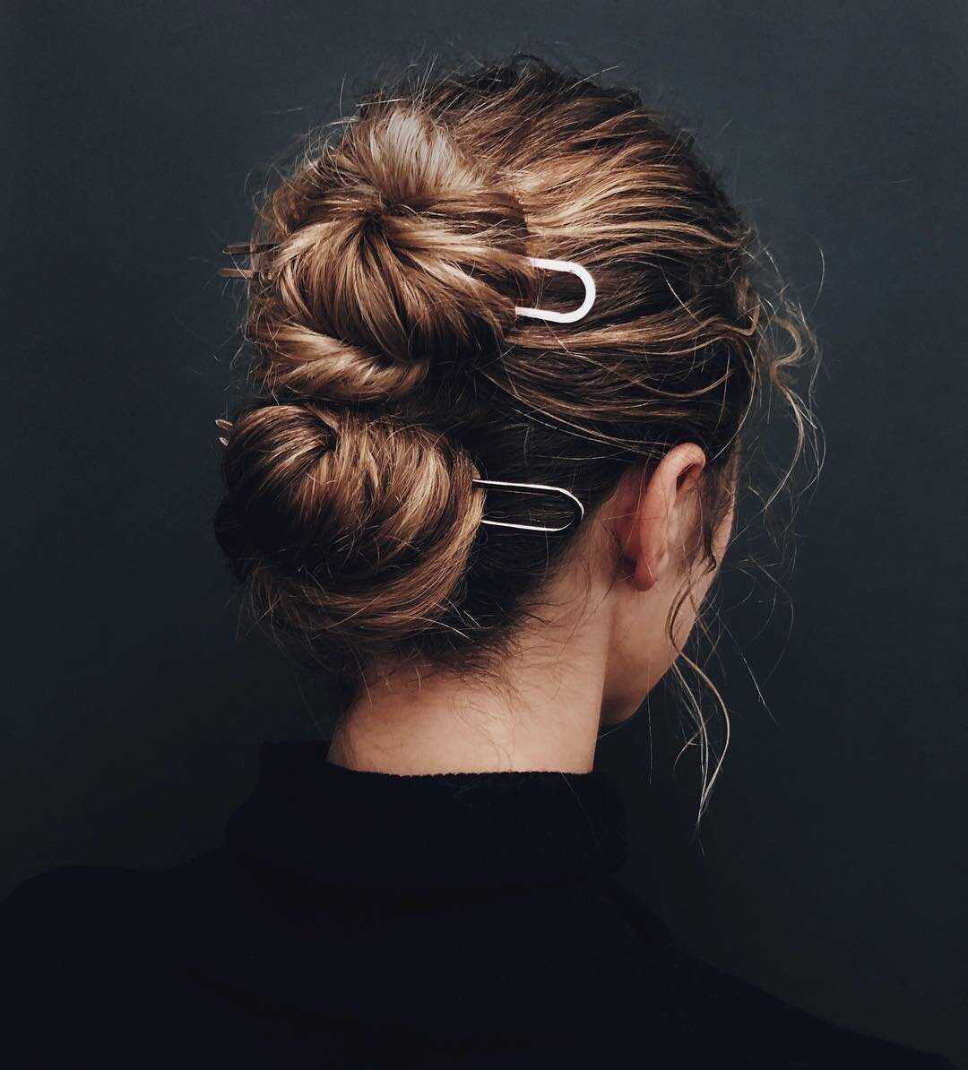 - Оригинальный пучок также делается на основе хвоста. Он собирается на макушке и делится на две части. Одна часть крепко закручивается вокруг основания и крепко закрепляется заколкой. Вторая часть укладывается небрежно.