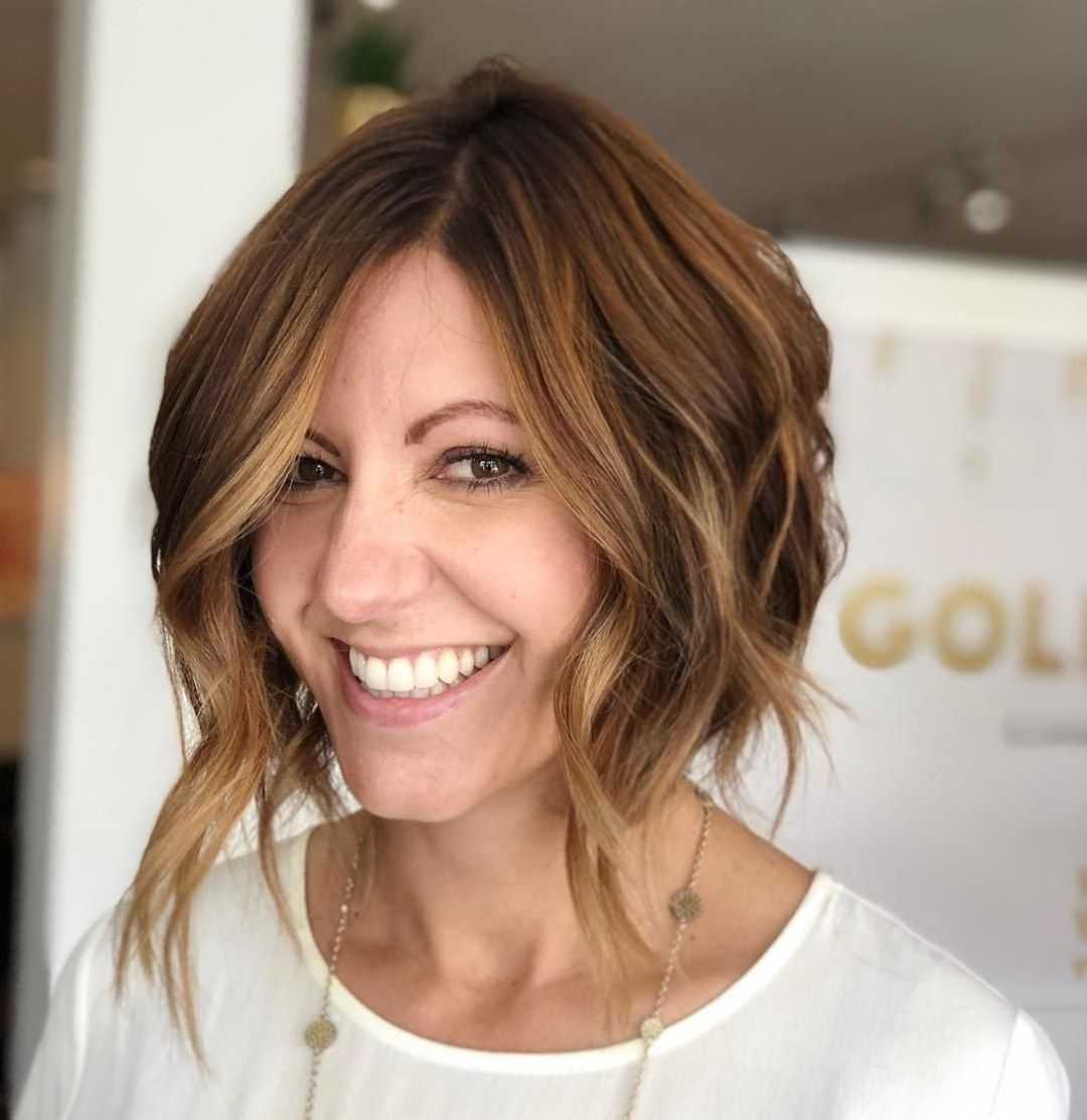 Если вам нужна изысканная прическа, которую легко поддерживать, попробуйте вырез А-силуэта. Каскадные прически боб хорошо подходят женщинам с округлыми лицами, потому что длинные слои до подбородка создают эффект стройности. Нам также нравится цвет этого конкретного боба: коричневые тона при каждом повороте головы придают неожиданный блеск блонда.