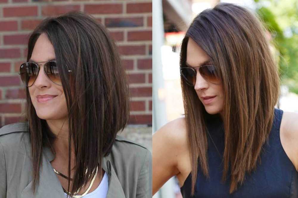 Удлиненное каре – интересный вариант для волос длиной ниже плеч. От классического варианта оно отличается тем, что волосы спереди длиннее задних прядей. Для девушек с лишним весом такой фасон поможет скрыть пухлые щечки.