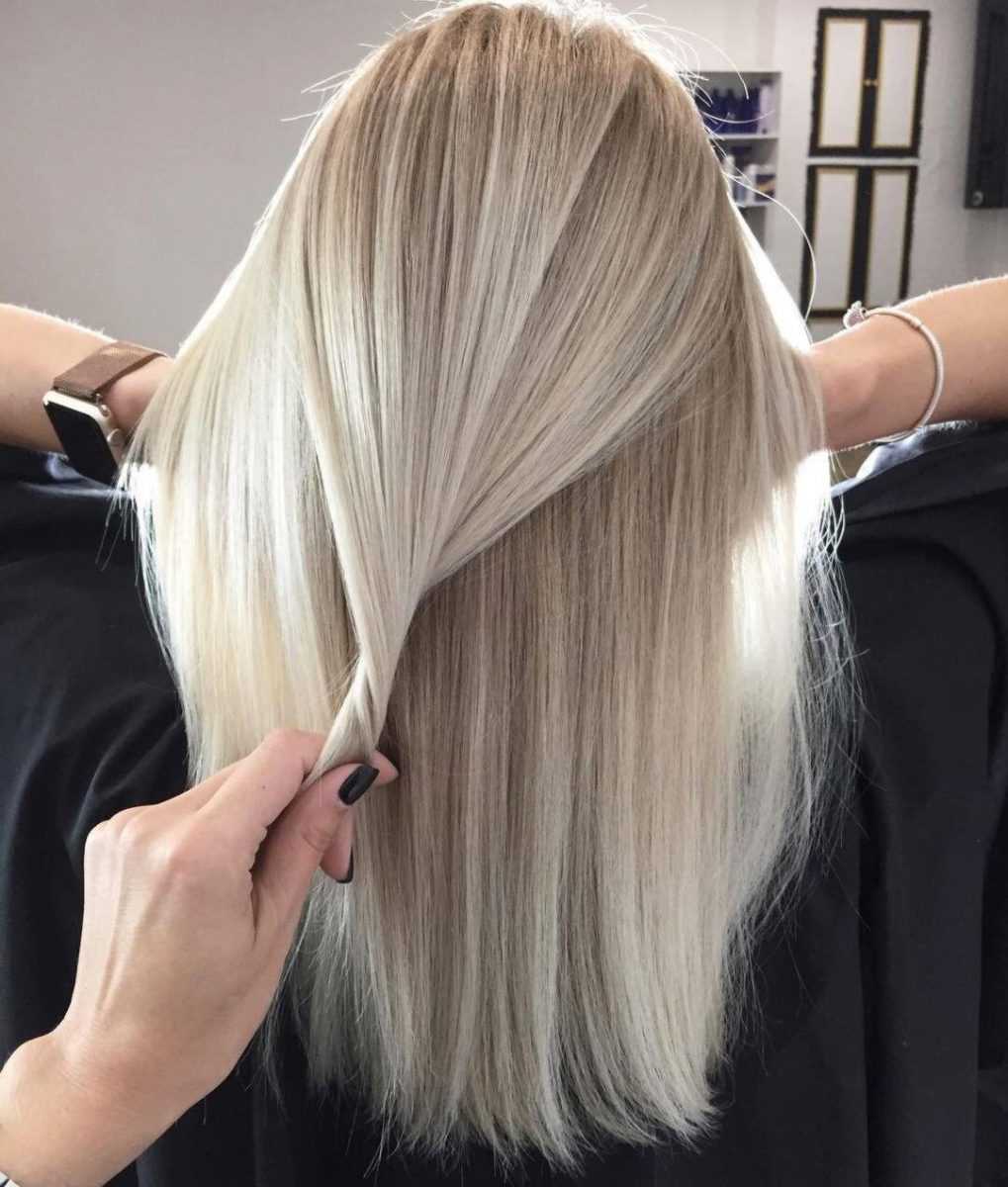 Для седых волос актуален платиновый блонд. Цвет прекрасно скрывает седину, поскольку они близки по тону. Платина пропитана благородностью и статусностью, поэтому она отлично подходит взрослым дамам.