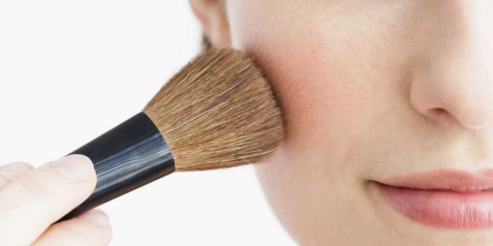 - Нанести на скулы румяна розовых или персиковых тонов. Растушевать границы.