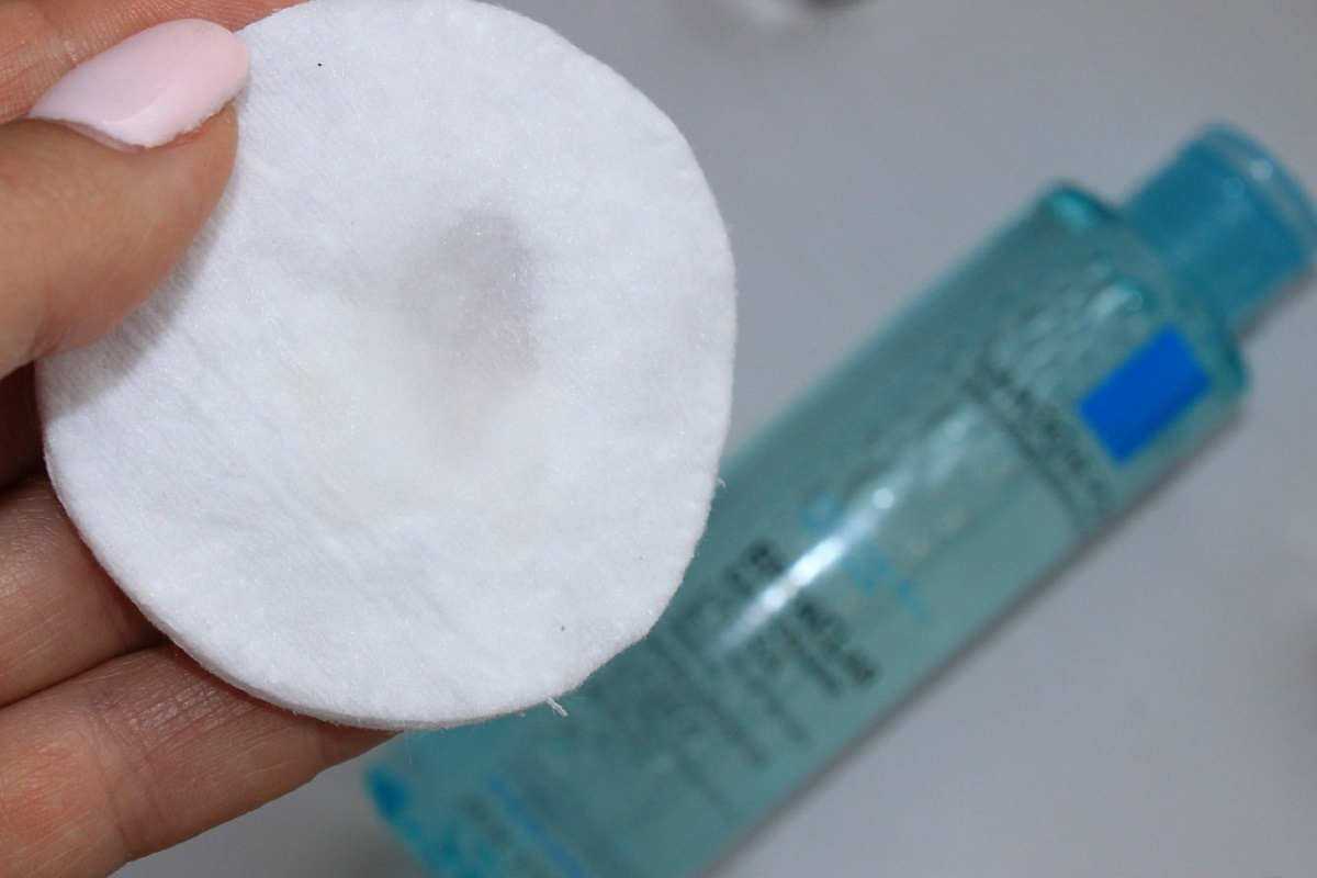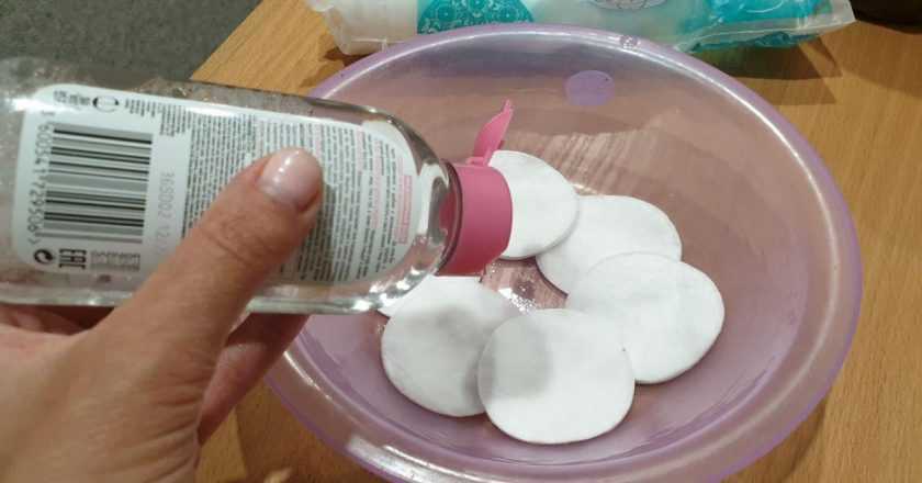 - Промокните ватный диск мицеллярной водой или другим средством для снятия макияжа.