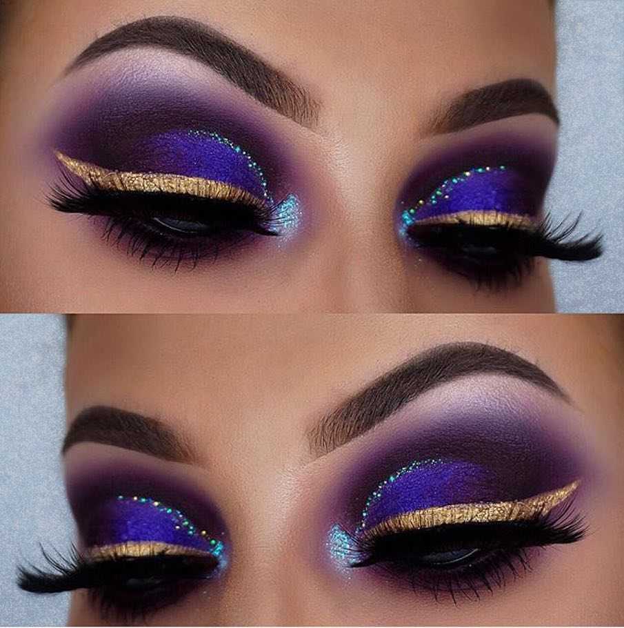 По такой же схеме можно сделать двойную стрелку – поверх обычной делаете тонкую линию, на которую затем выкладываете глиттер. Очень стильно выглядит макияж с золотым глиттером поверх чёрной стрелки. Чтобы придать образу еще большей «изюминки», вы можете нанести немного блёсток на нижнее веко ближе к внутреннему уголку.