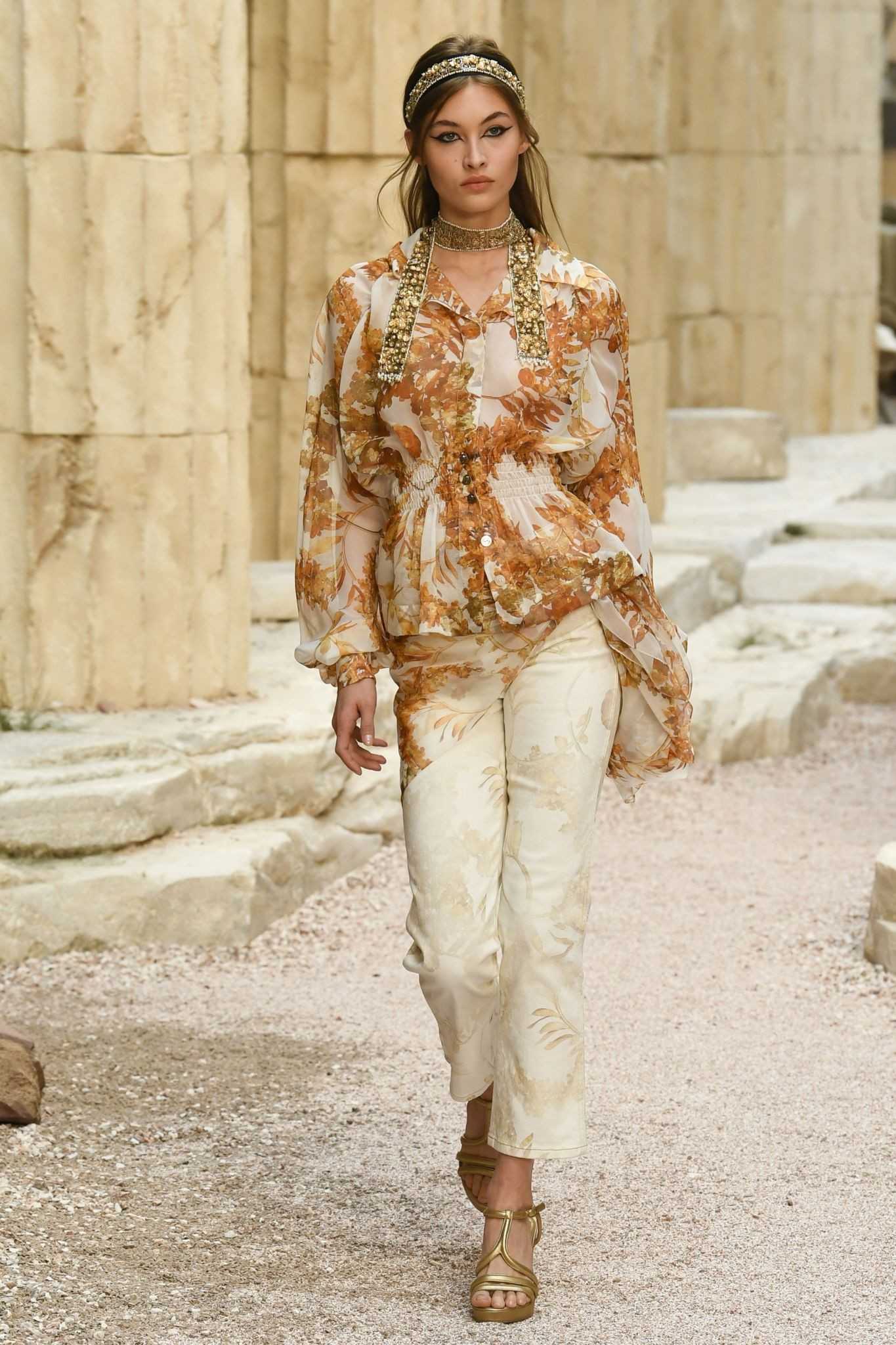 Карл Лагерфельд не стал отказываться от столь яркого тренда, щедро использовав в своей новой коллекции драгоценный металл. Цвет золота изумительно сочетается с вычурными фасонами греческих платьев, дополняет многочисленные драпировки, оттеняет легкость блуз, подчеркивает роскошь корсетов, добавляет «дороговизны» свитшотам и костюмам в стилистике спорт-шик.