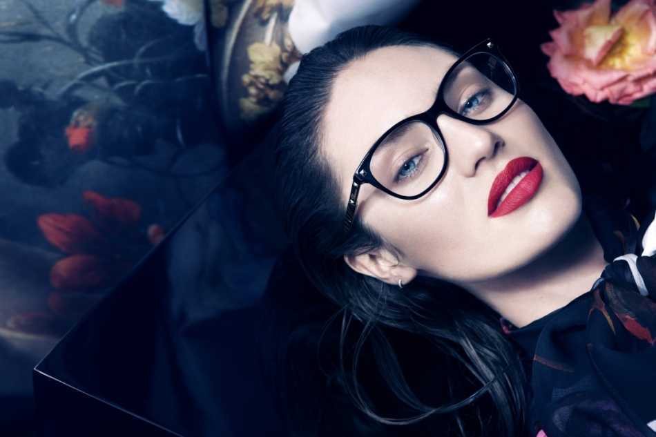 Алая помада — отличный акцент в макияже под очки в чёрной оправе