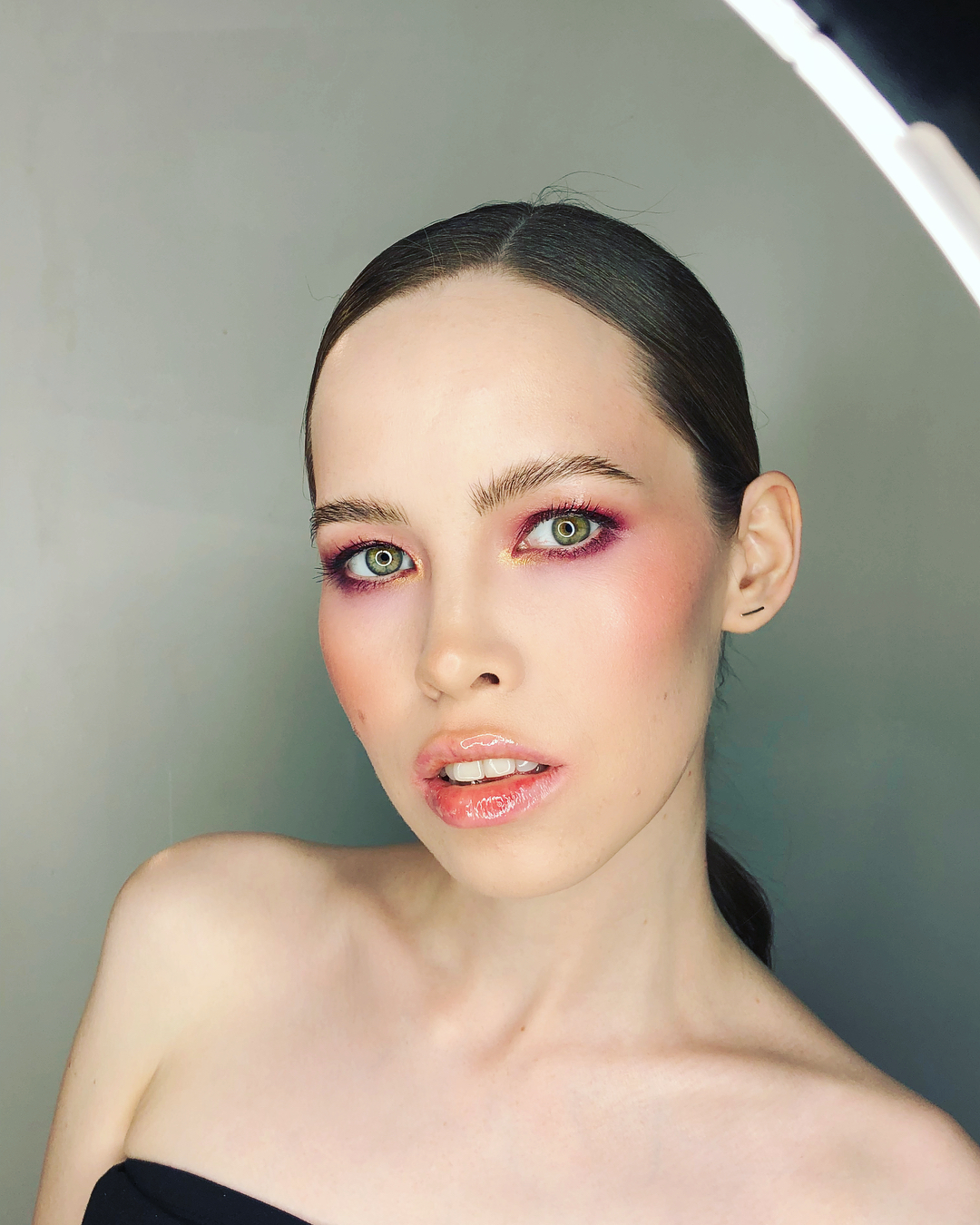 - В завершение быстро наносим “жидкое стекло” для эффекта влажного макияжа.