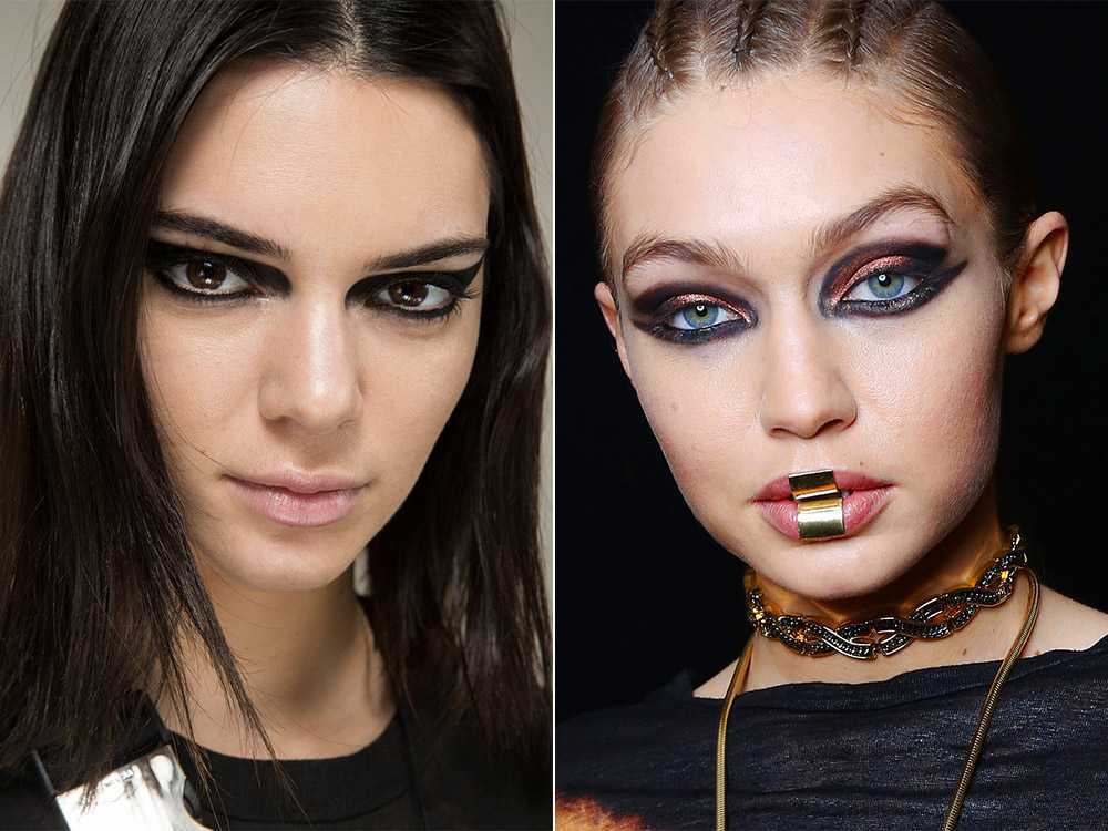 В тренде графическая четкость, футуристические мотивы, «сияющая кожа», которую создают с помощью хайлайтера, модный макияж «кошачий взгляд».