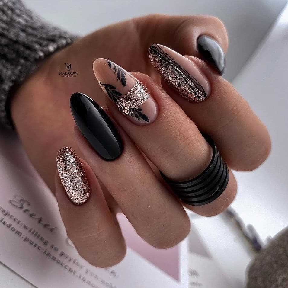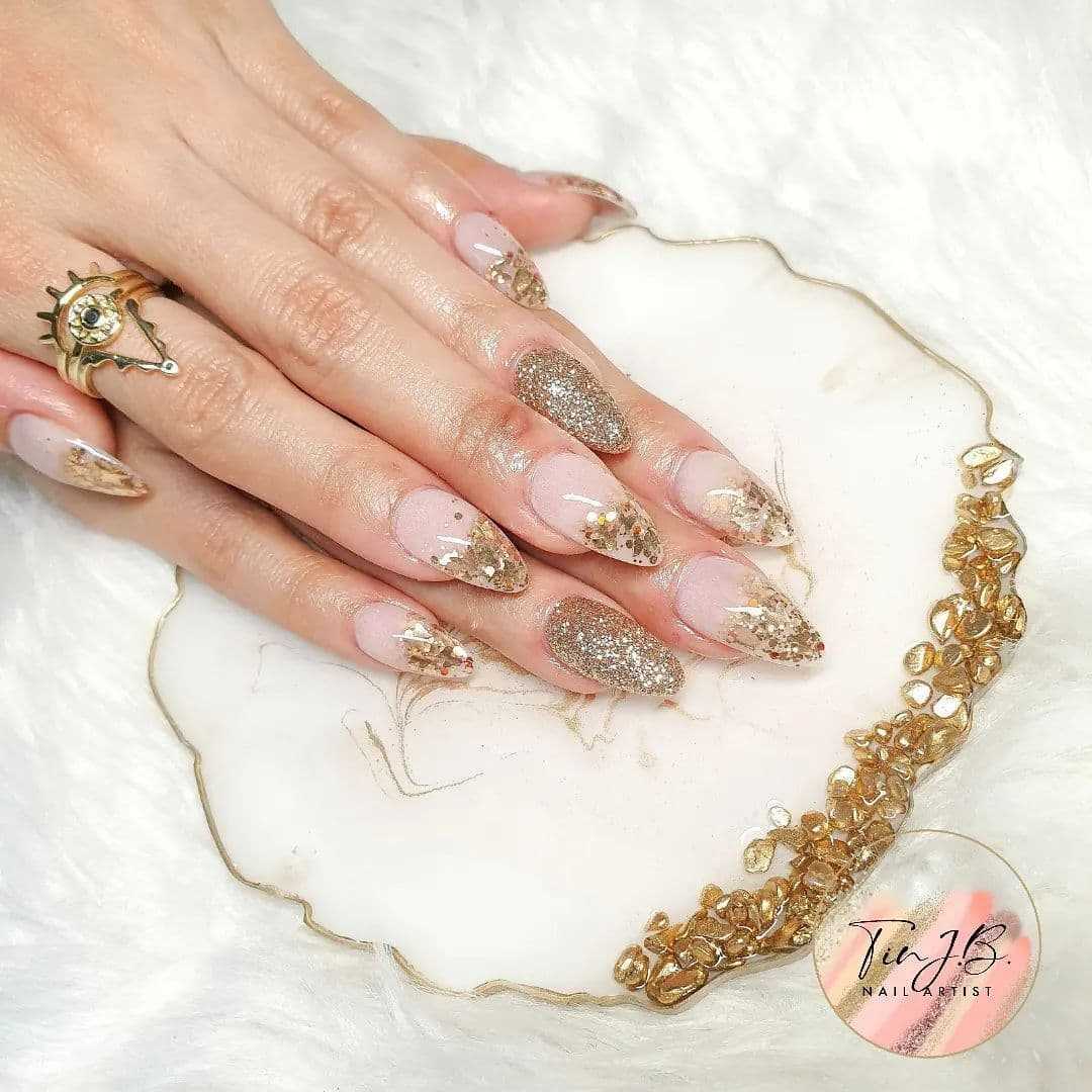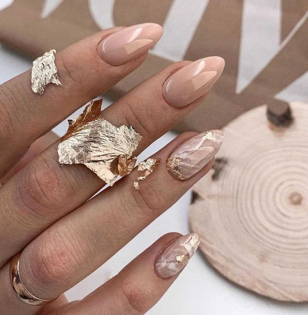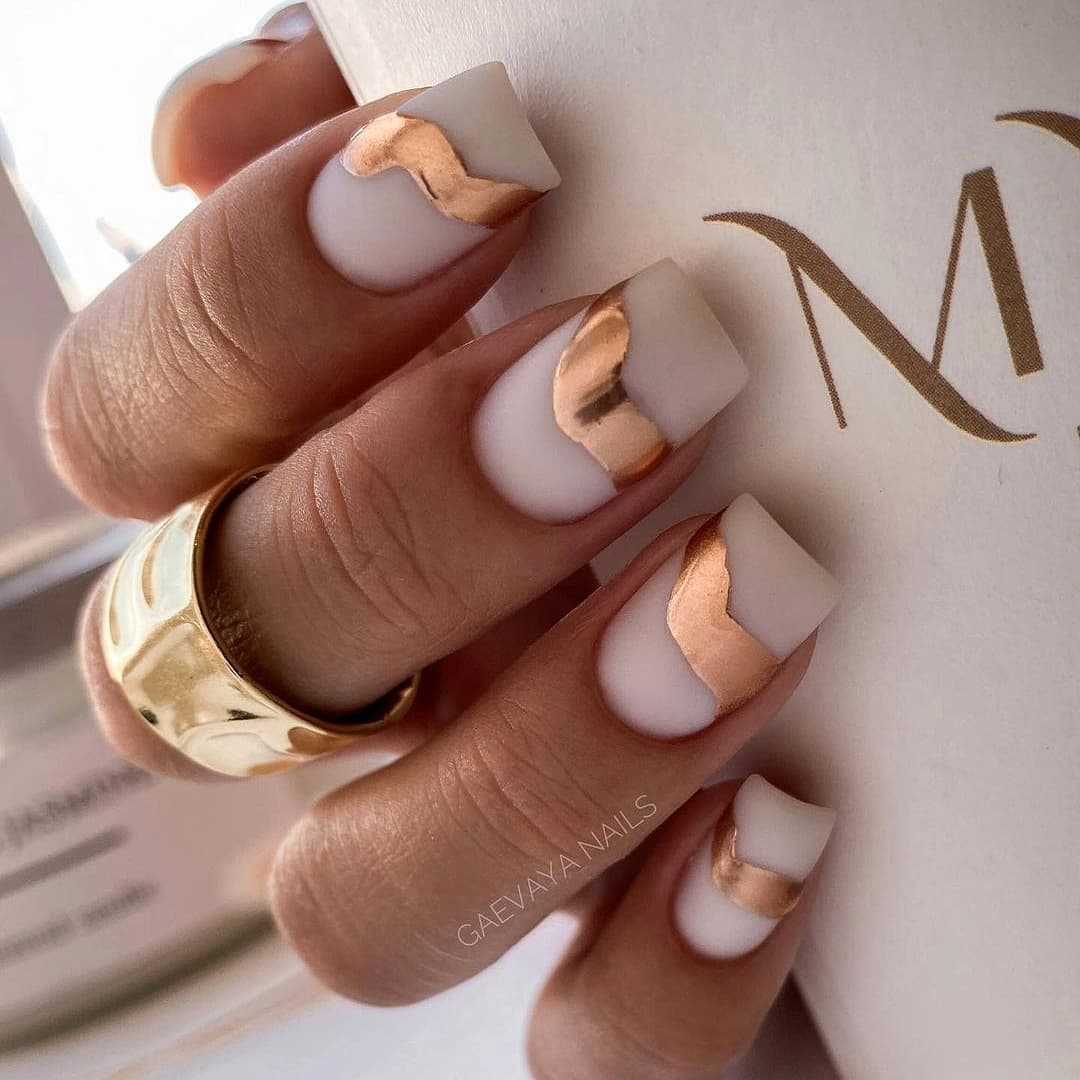 Приходится по душе настоящим леди. Естественный тон и золотой перелив отлично смотрятся в сочетании с золотой фольгой, ветвистыми узорами и френчем. Неплохо выглядят геометрические узоры и пайетки.