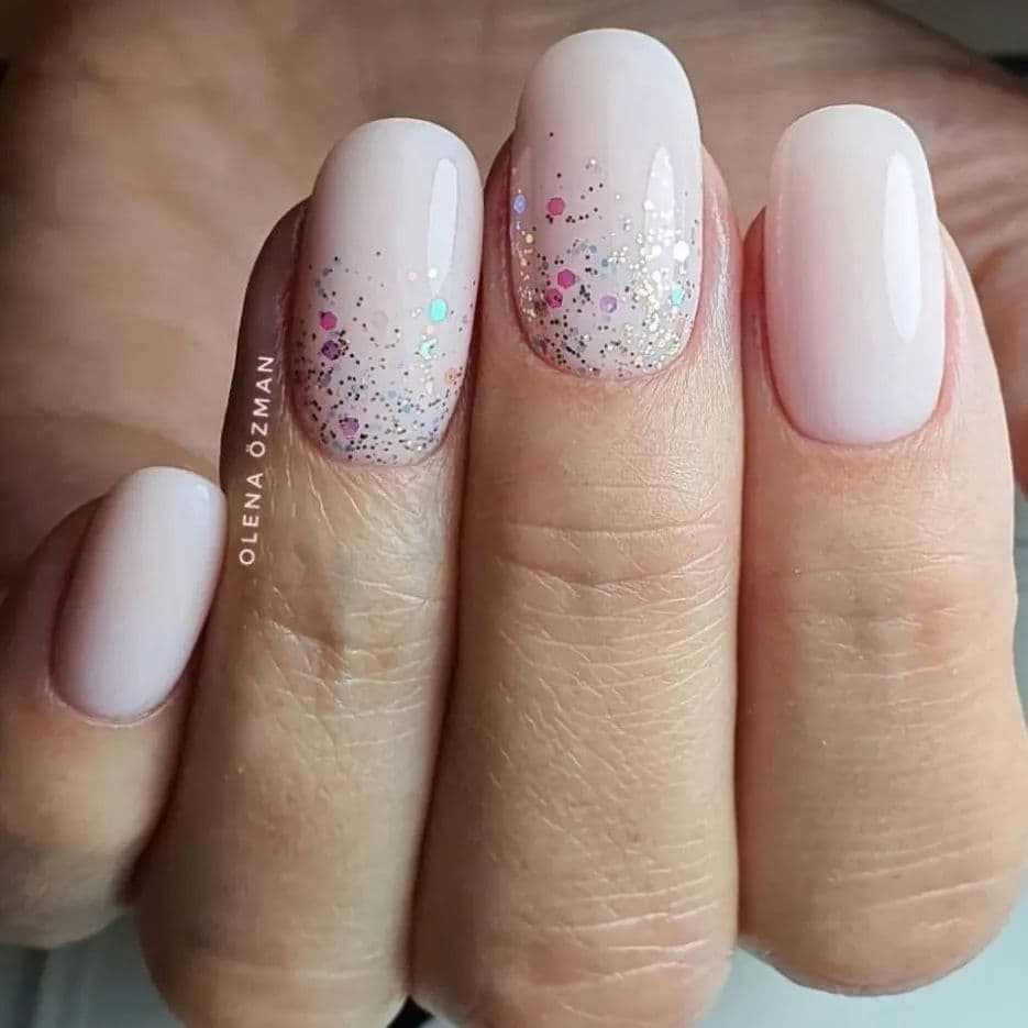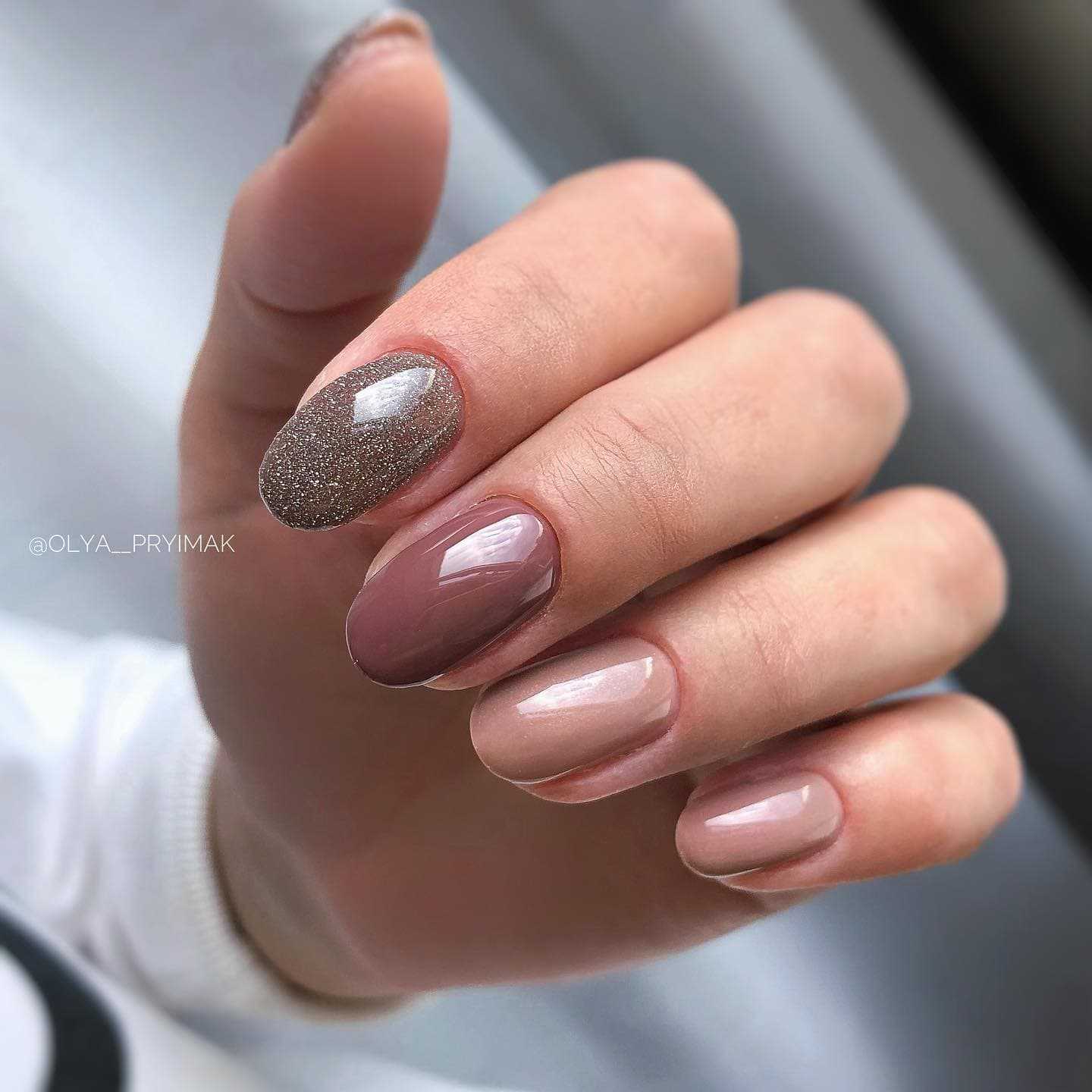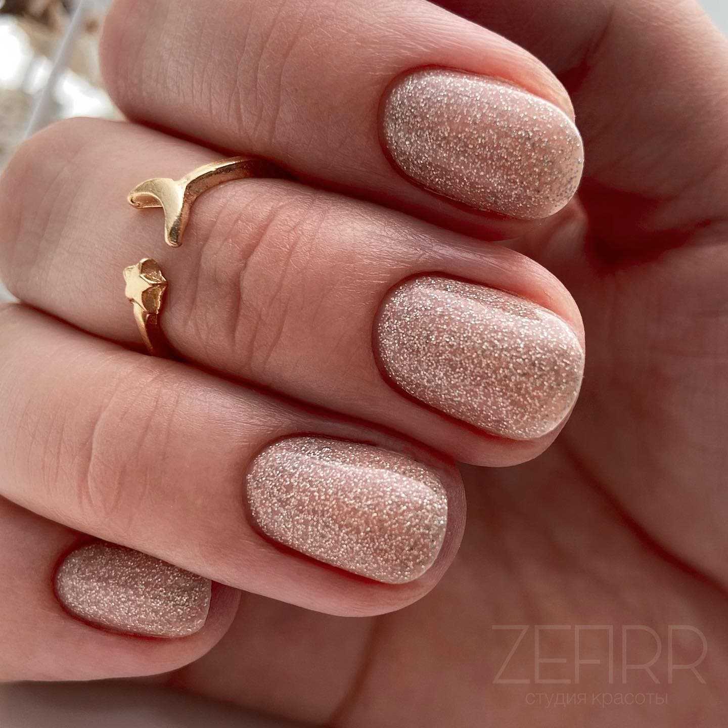 Зимний нюдовый маникюр 2022 на короткие овальные ногти — это, прежде всего, блестки, омбре (поможет визуально “вытянуть” ноготь, если есть такая потребность), фольга.