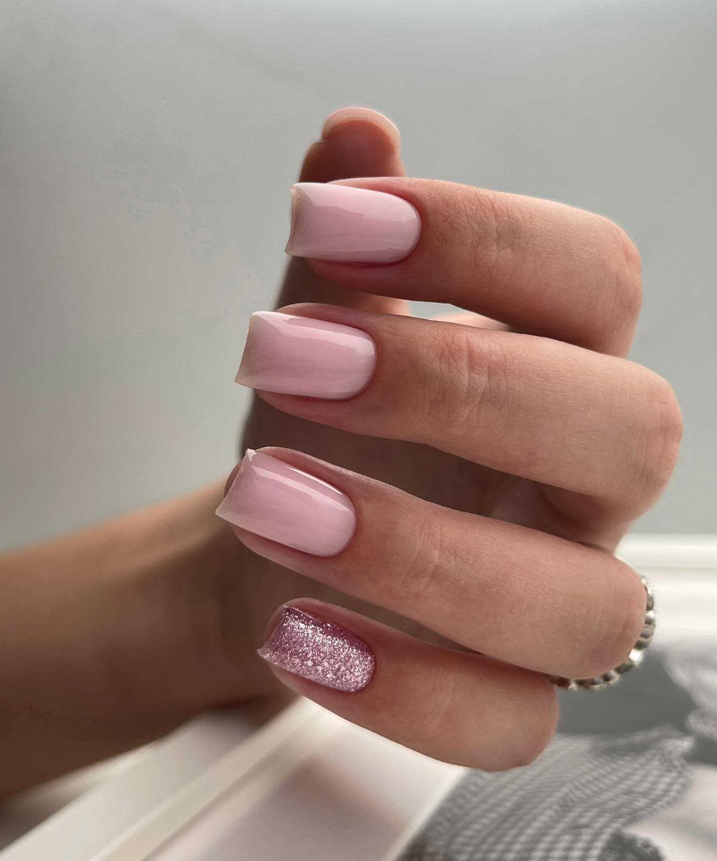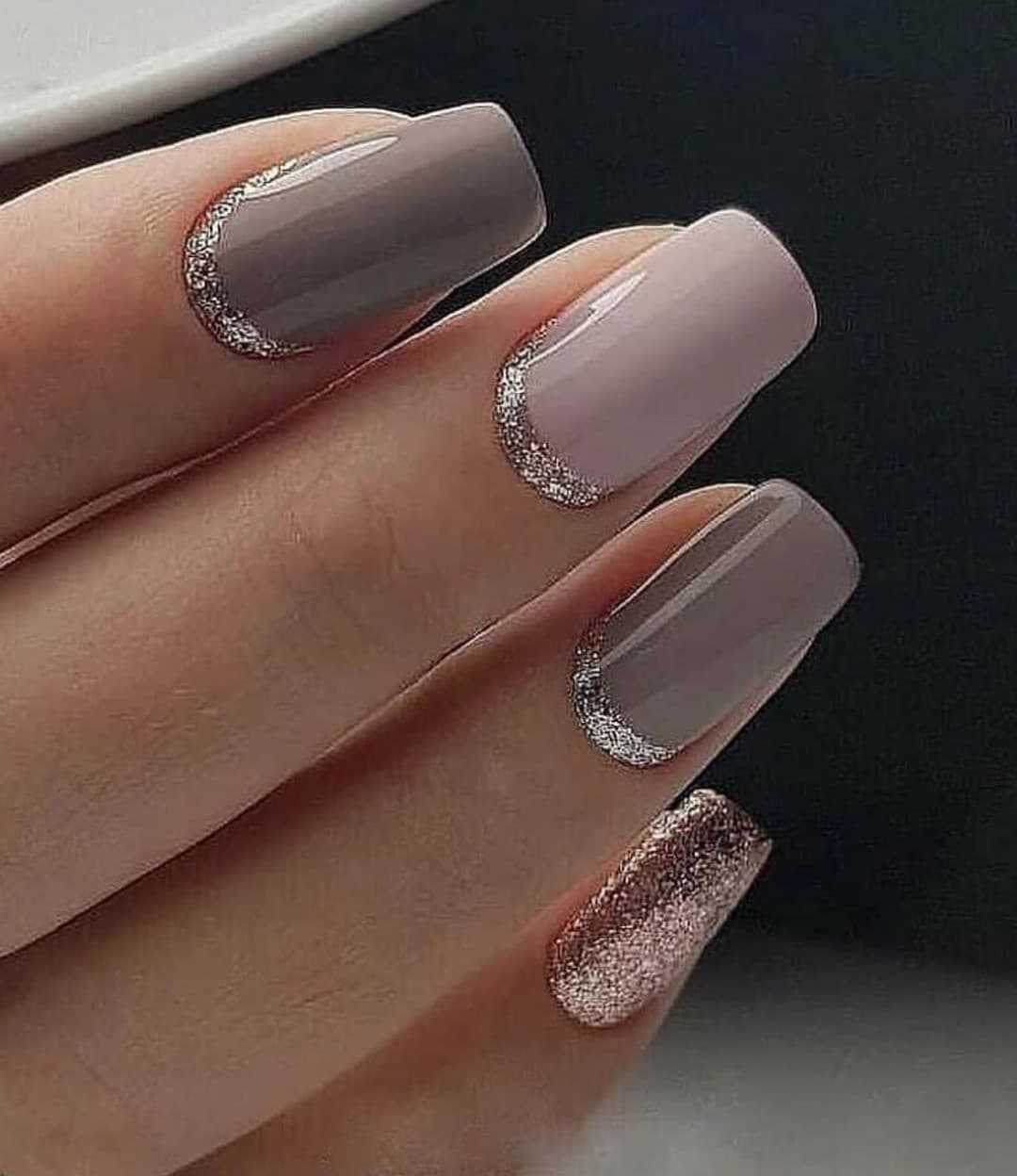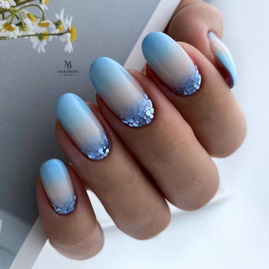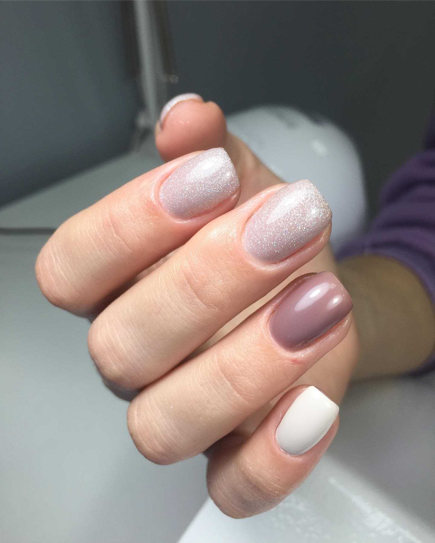 Зимний нюдовый маникюр 2022 на короткие овальные ногти — это, прежде всего, блестки, омбре (поможет визуально “вытянуть” ноготь, если есть такая потребность), фольга.