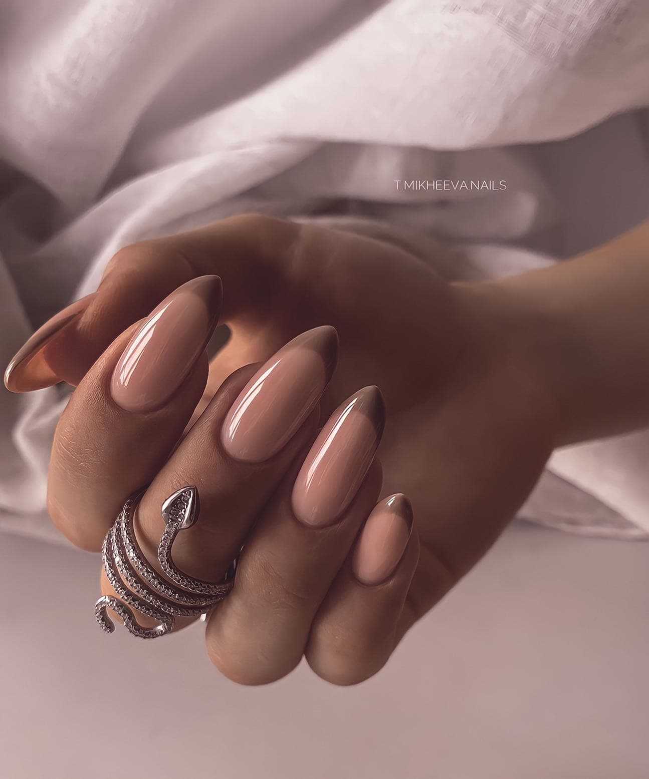 - Самое время использовать темные оттенки нюда — беж, коричневый, песочный и так далее.