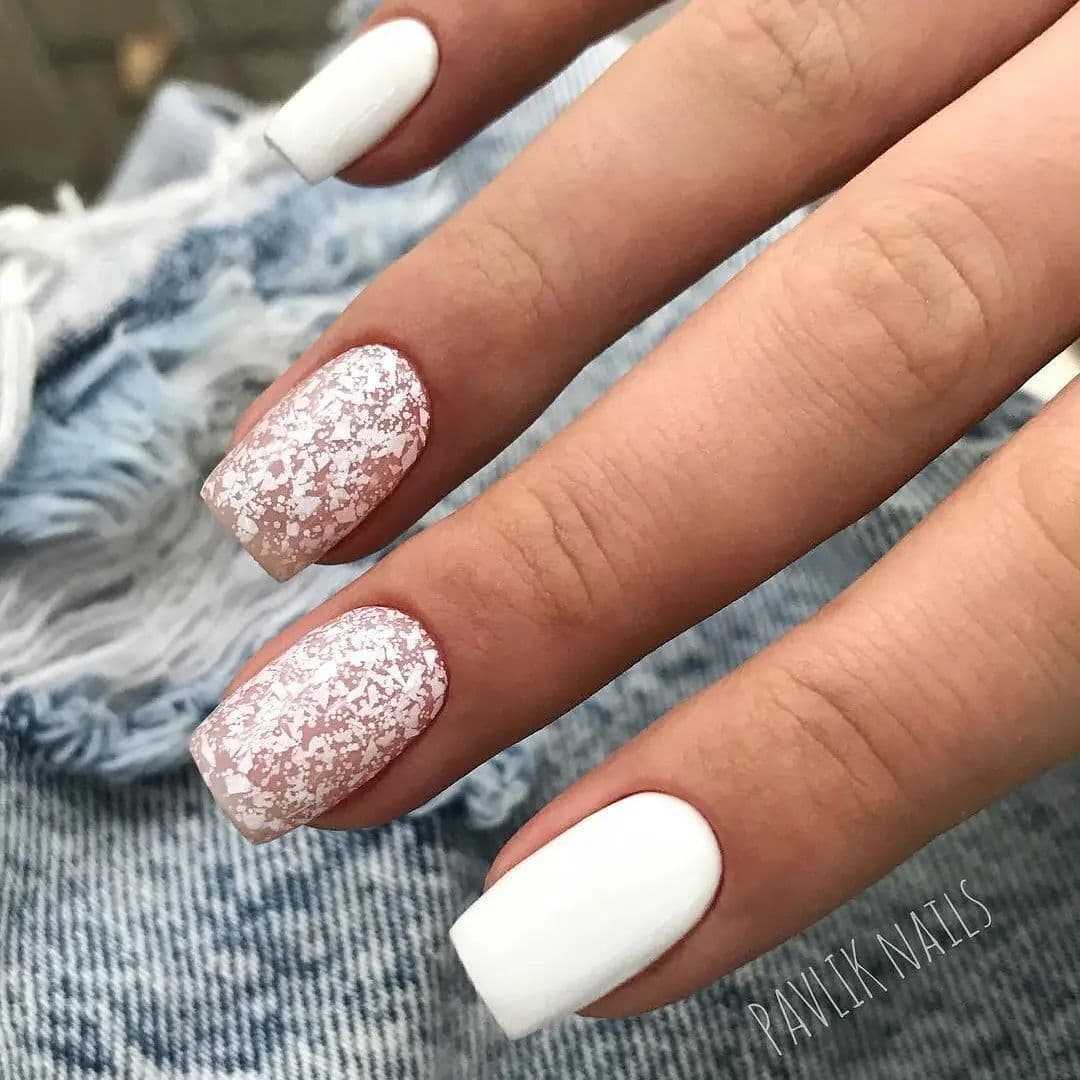 Выполняется преимущественно в стиле минимализма. Свежо и изысканно сочетается с геометрическим градиентом. Неплохо выглядит с блестками и фольгированными вставками.