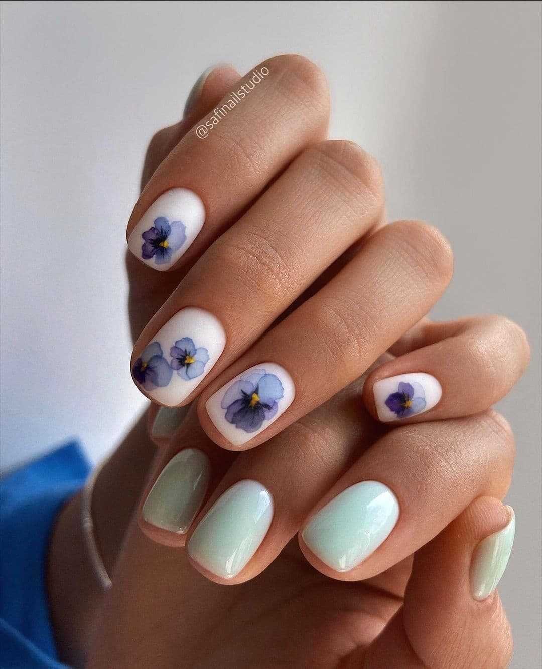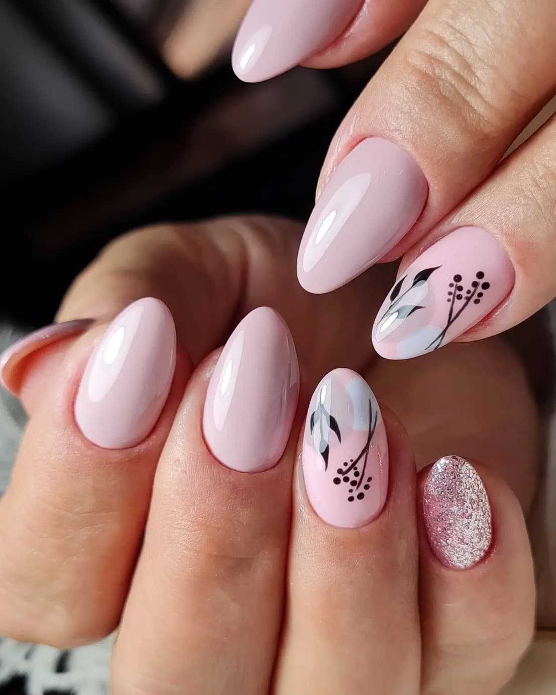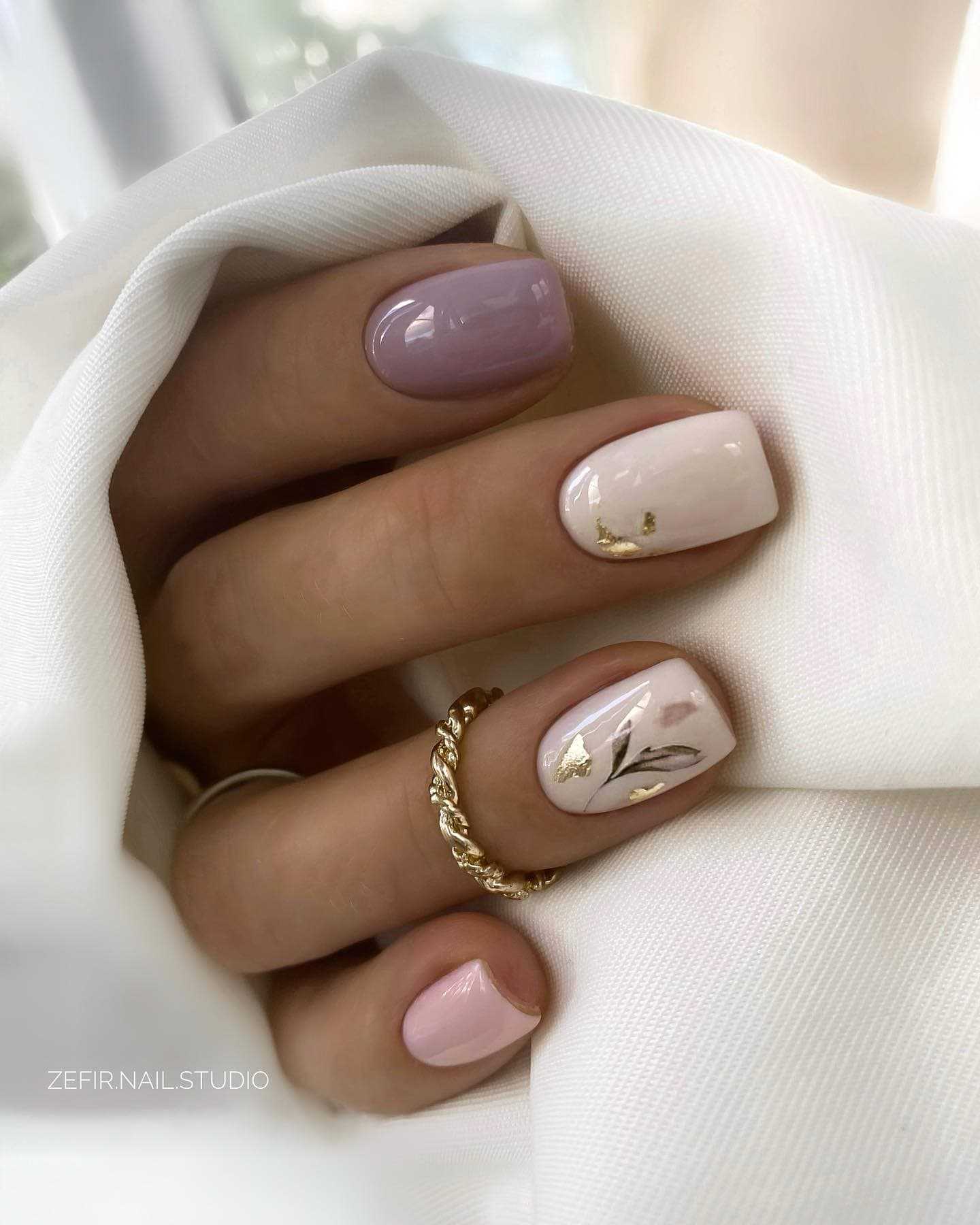 - Весной не хочется “перегружать” маникюр, поэтому рекомендуем ограничиться дизайном одного-двух пальцев на фоне однотонных остальных.