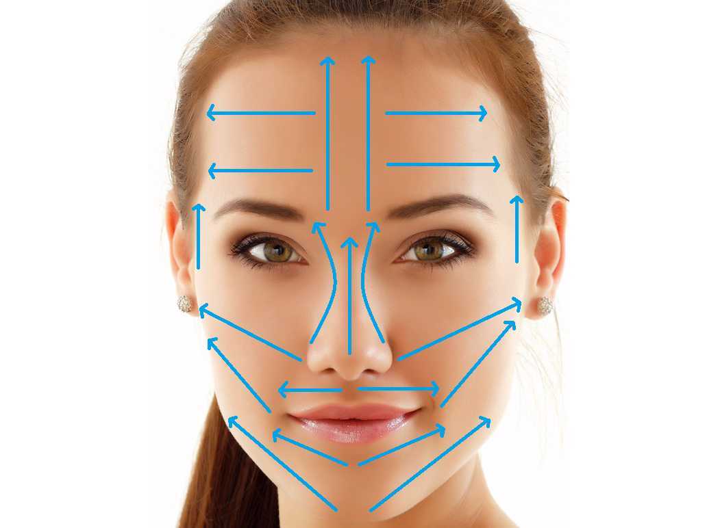 Чрезвычайно важно проводить процедуру аккуратно, придерживаясь массажных линий. То есть от середины лба к вискам, а также от носа к вискам и от середины подбородка к вискам
