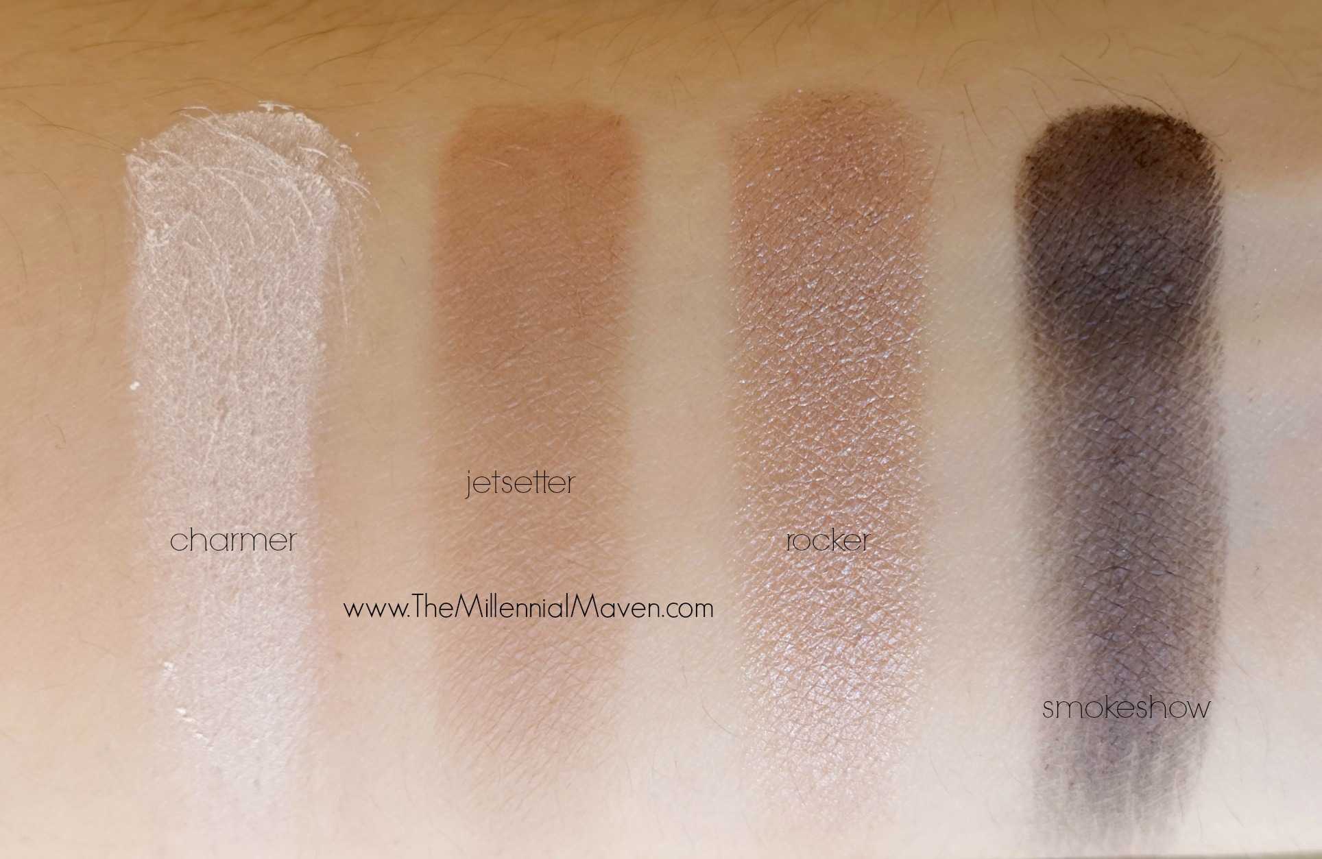 Charmer is slightly powdery, but that is typical for a light colored matte. Smokeshow is pretty good, but I did have to go over the swatch a couple of times to achieve really deep pigmentation. The texture of the shadow also has a stiffer and drier feel than the rest when I dipped my finger into it for the swatch.