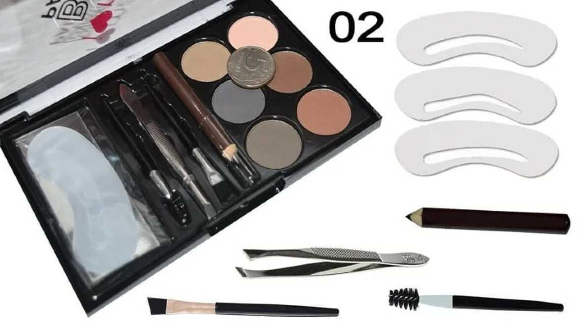 - Комплектация набора. Она может значительно отличаться. Самые простые варианты содержат несколько оттенков теней + кисточку. Наиболее же дорогостоящие укомплектованы дополнительно трафаретами с разной формой бровей, воском и гелем-закрепителем;