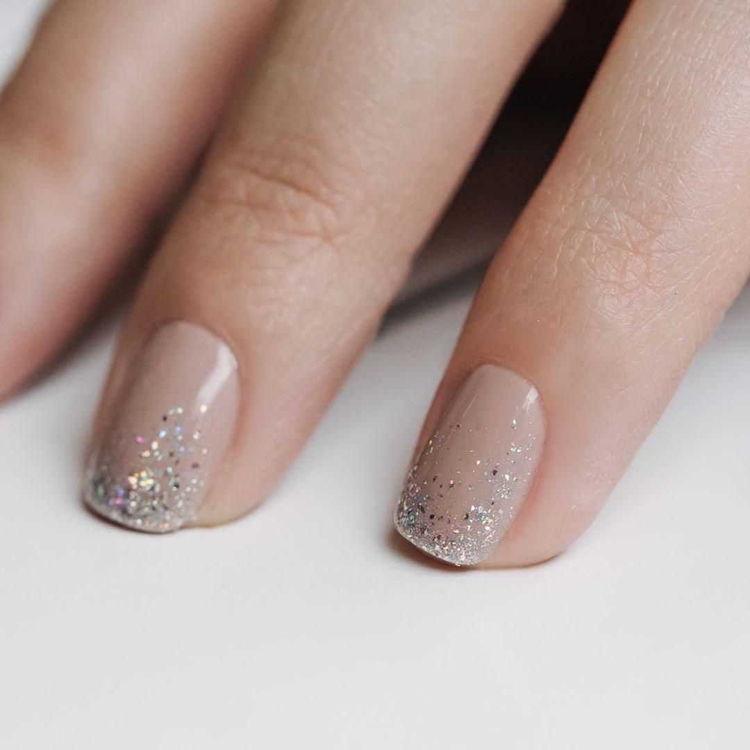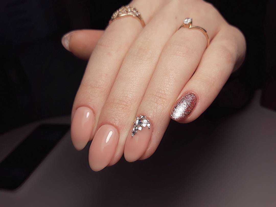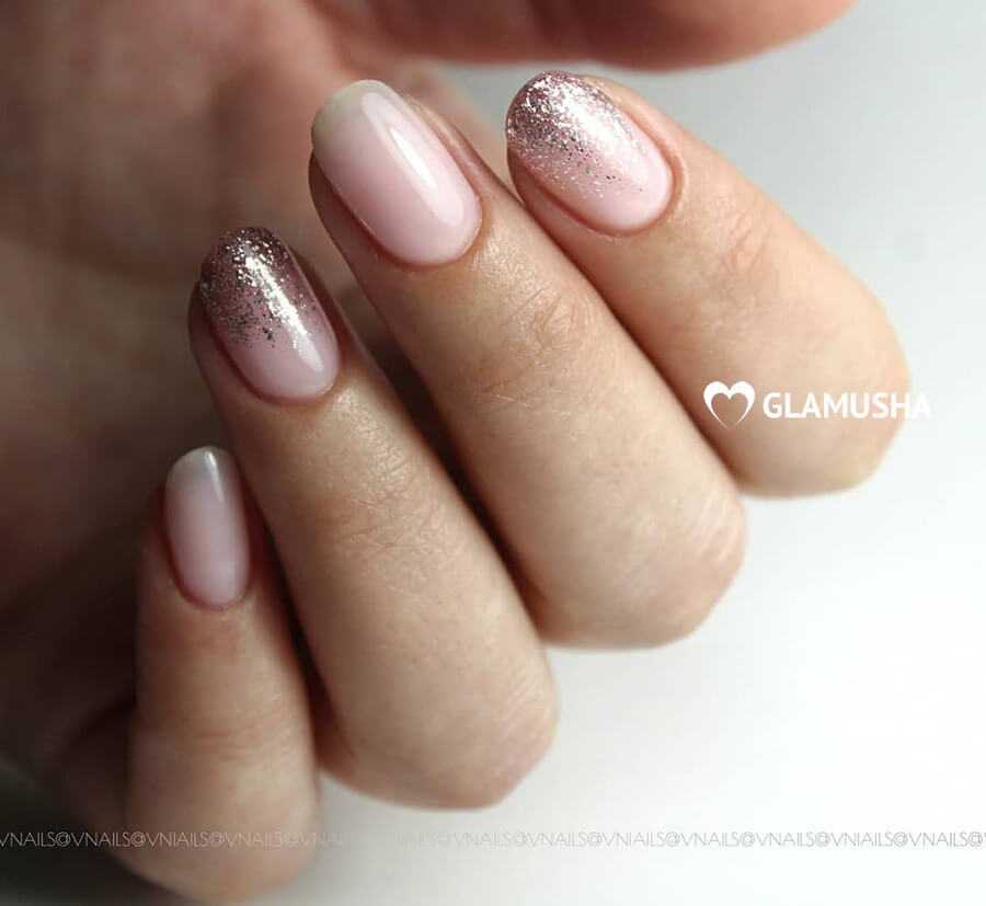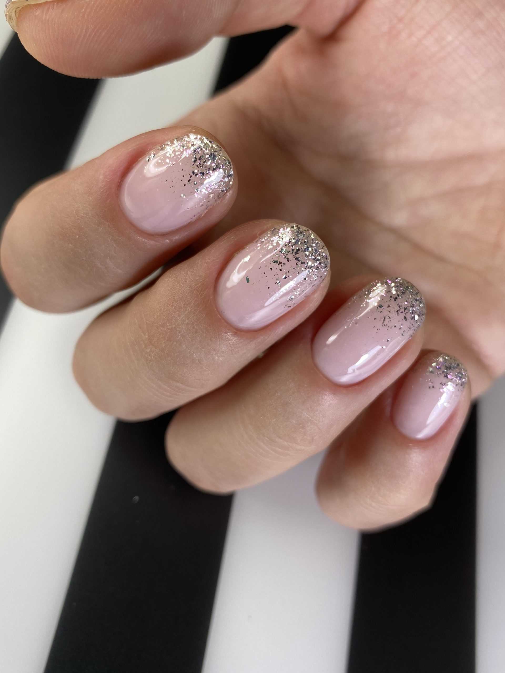 Зимний нюдовый маникюр 2022 на короткие овальные ногти — это, прежде всего, блестки, омбре (поможет визуально “вытянуть” ноготь, если есть такая потребность), фольга.