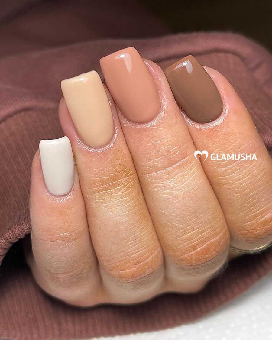 - Самое время использовать темные оттенки нюда — беж, коричневый, песочный и так далее.