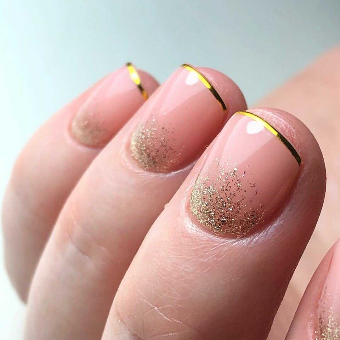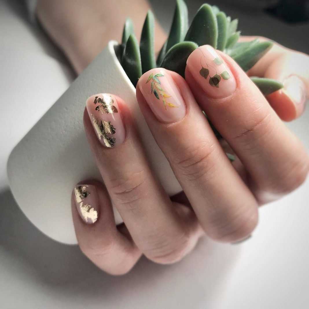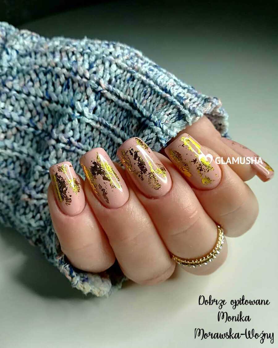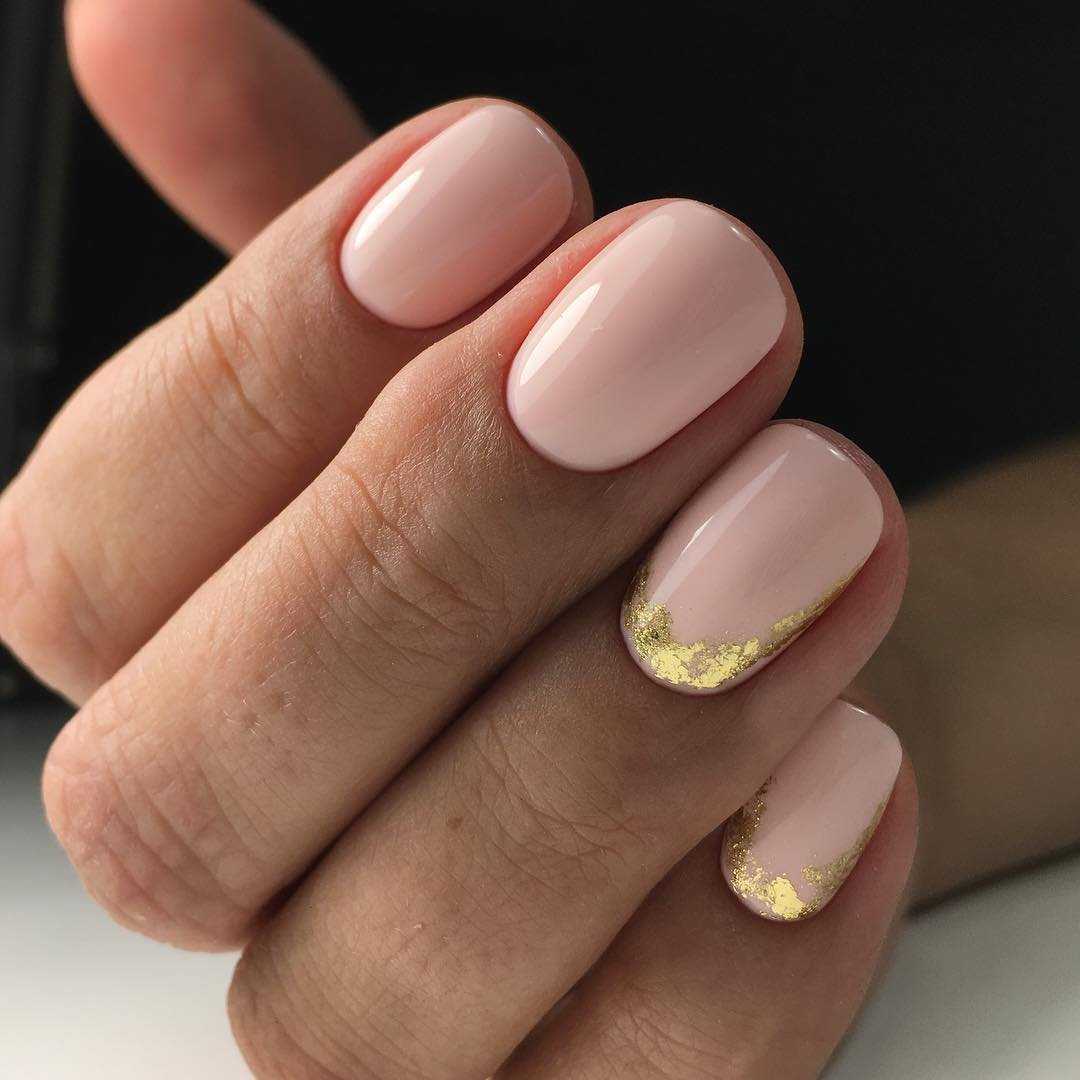На первый взгляд может показаться, что золотой дизайн для ногтя хорошо смотрится только в идеях для праздничного маникюра. Но все зависит от того, как вы его оформите. Нюдовые тона в сочетании с сусальным золотом хорошо подойдут для повседневного образа.