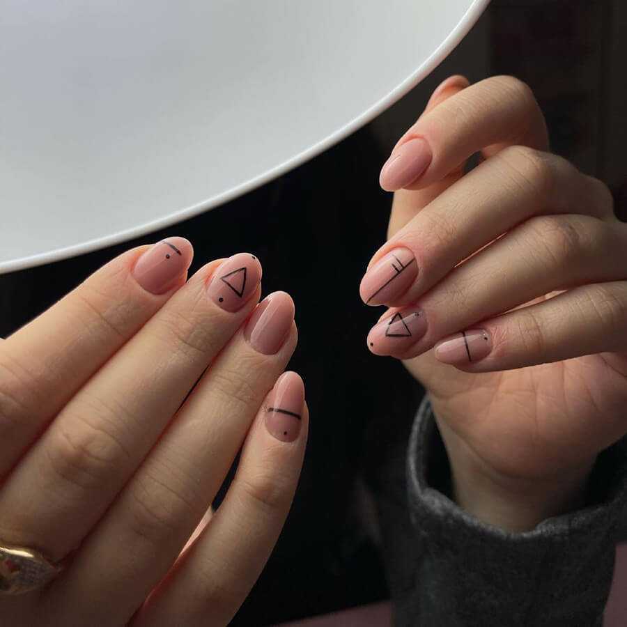 В отношении геометрических форм и дизайна нюдового цвета ногтей, то здесь как говорится самое широкое поле для реализации любых возможностей с нестандартными или проверенными идеями, как для классического исполнения маникюра с геометрическими составляющими, так и с неординарными, экстравагантными в нюдовом исполнении.