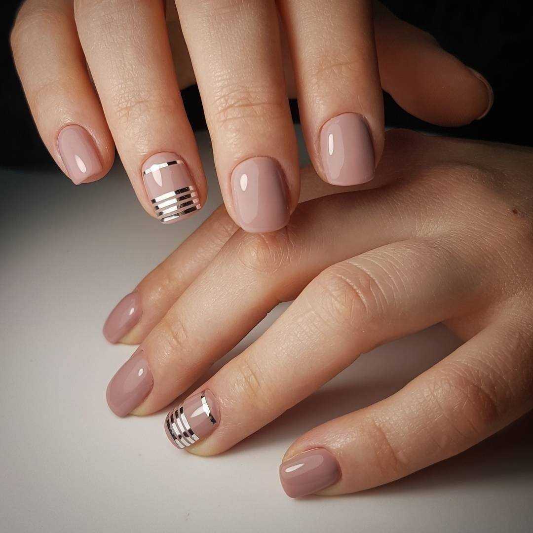 - Полоски из фольги с блеском. Они эффектно подчеркнут бежевый (нюд) маникюр и придадут ему последний штрих.