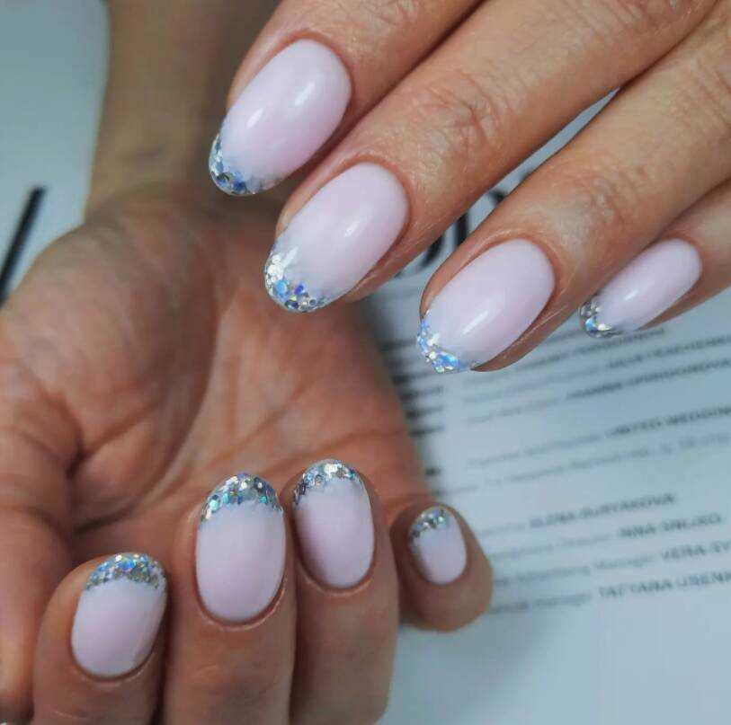 Использование различного рода блесток обязательно для французского маникюра на особый случай. Для торжественного, праздничного, вечернего, событийного френч-маникюра в этом году мастера нейл-арта рекомендуют модные дизайны с блестками. Классический французский маникюр эффектно дополнят и украсят золотая или серебристая улыбка-окантовка, сияющие стразы, блестящие бусины и декоративные камешки различной формы, цвета и размера. Очень популярны в 2022 году блестящие нейл-украшения из фольги (жидкой, голографической, самоклеящейся, жатой, зеркальной), потали, слюды, камифубуков.