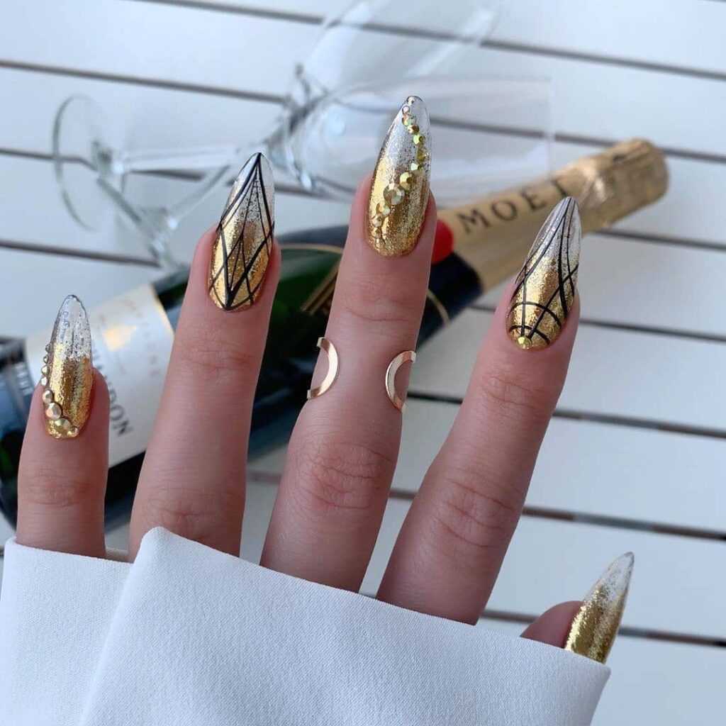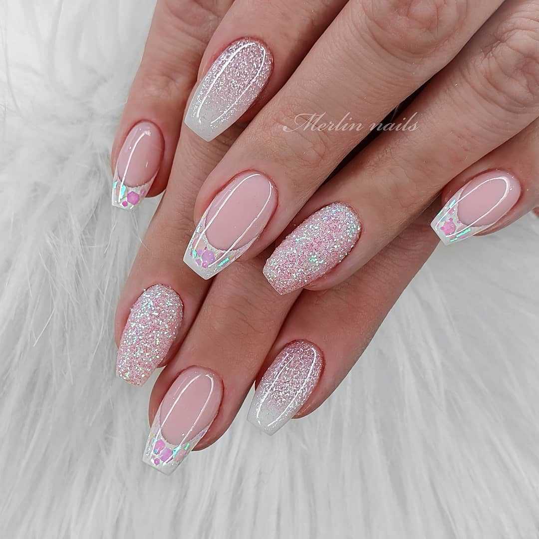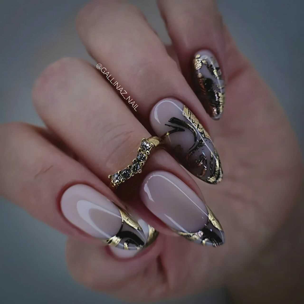 Для нюдового дизайна с глянцем используется декор из золота и серебра, яркие и матовые блестки, технику нанесения лака с градиентом и переходами.
