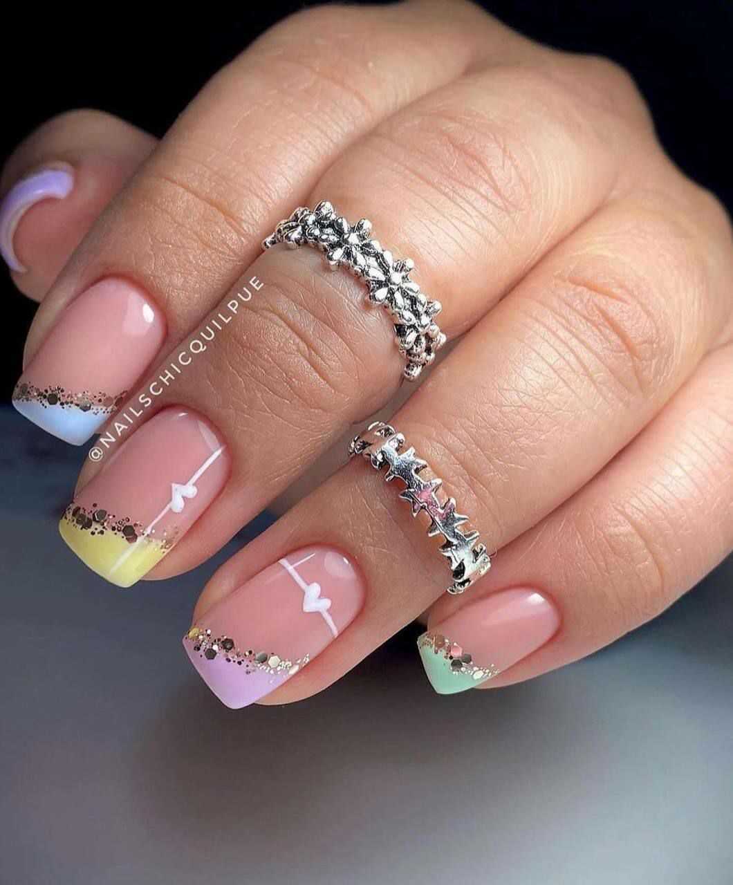 В летнем французском маникюре допускается использовать более двух ярких оттенков покрытия