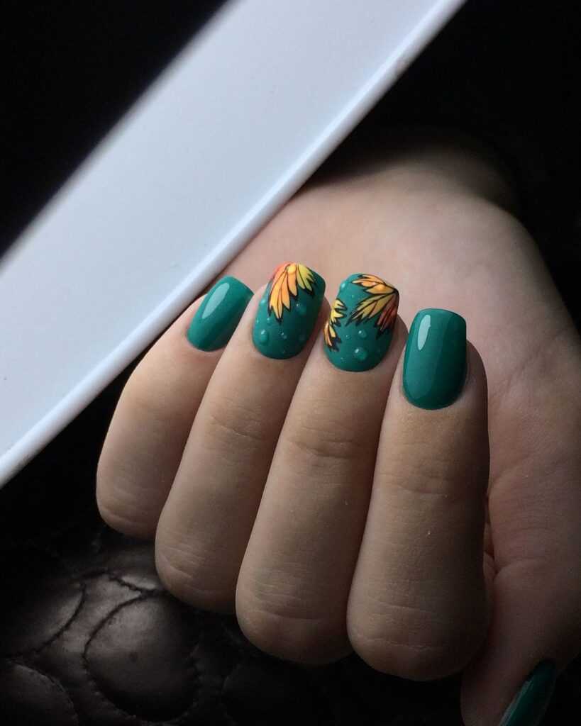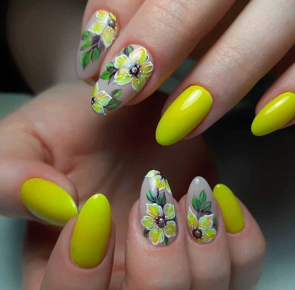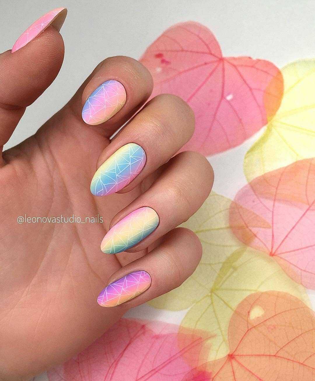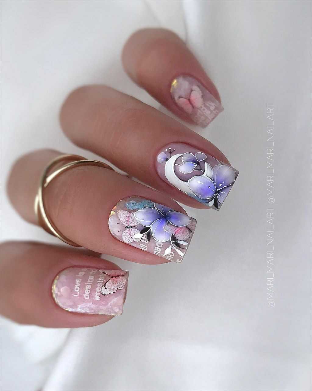 В весеннее время в тренде флористические мотивы. Выбирают нежные пастельные тона, например: сиреневый, нежно-желтый, мятно-зеленый. Можно рисовать цветочные узоры на базовом покрытии пастельного тона, можно использовать наклейки или стемпинг. Неплохо будет смотреться градиент из весенней цветовой гаммы. Посмотрите некоторые идеи для вдохновения на примере фото.