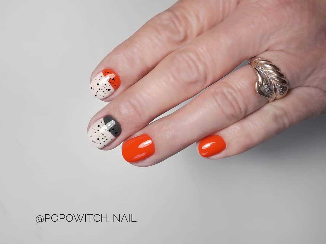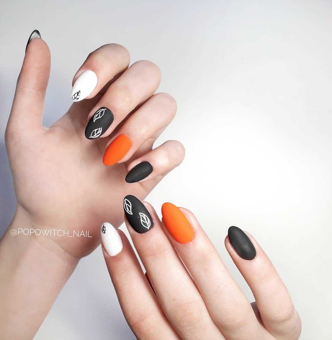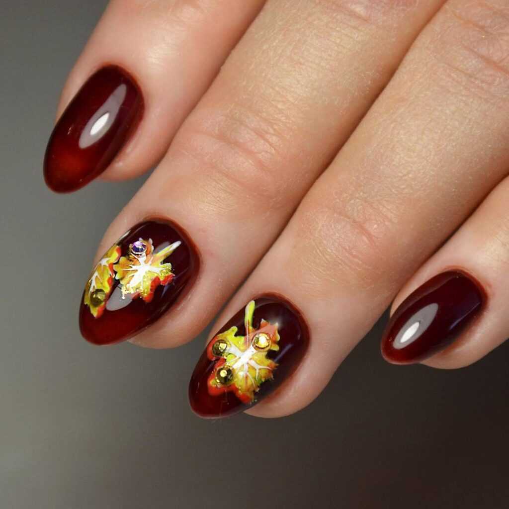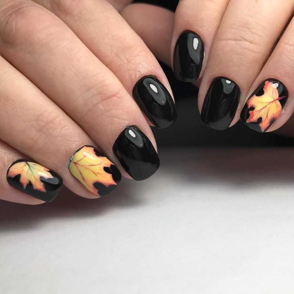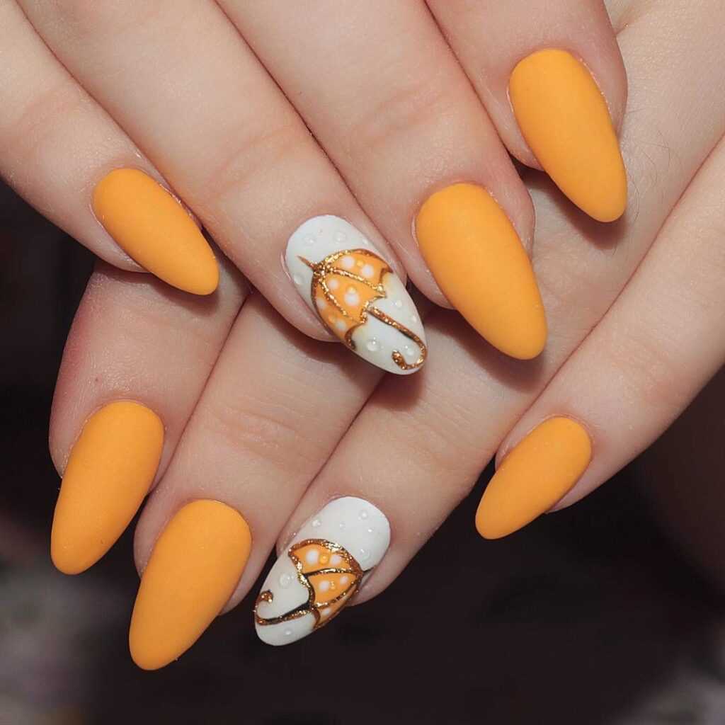 Осенняя пора ассоциируется с желтыми листьями, уютным пледом, чашечкой ароматного кофе и серыми тучами. Мастера nail art успешно воплощают эти символы в своем искусстве. На Хеллоуин можно стилизовать маникюр под тыкву, мухоморы, летучих мышей , паучков, осенние листья. Посмотрите на фото, как красиво смотрятся на ногтях осенние мотивы.