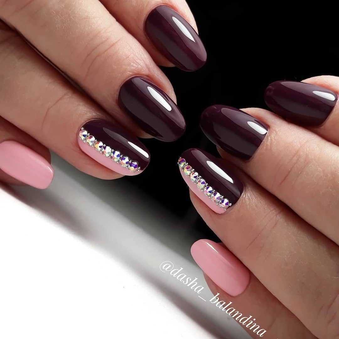 Нюдовый дизайн ногтей идеально дополнит праздничный образ. Это могут быть тематические рисунки, богатые декоры со стразами, цветовая гамма, блестки, глубокие темные бордовые, красные, синие тона в цвет платья.