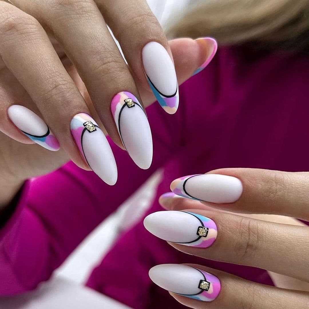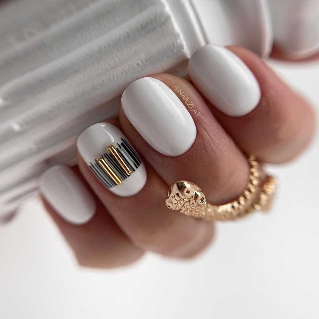Белый цвет идеален для лета. Он очень красиво смотрится на загорелых ручках. Можно оставить ноготочки однотонными или нарисовать милые рисунки. На молочной основе красиво смотрятся тонкие линии, абстракция и яркие пятна.