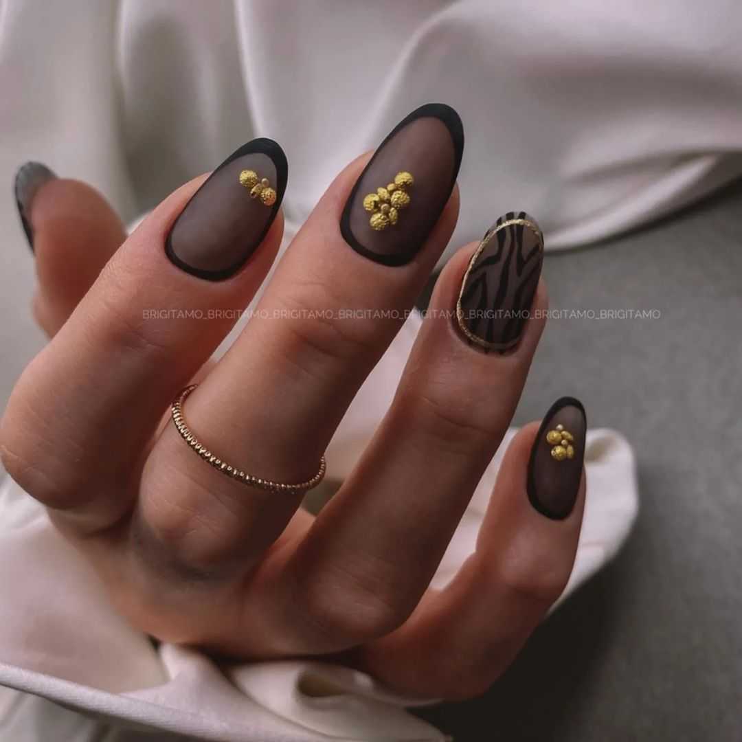 Нюдовые цвета часто выбирают для особых торжественных случаев. Миндалиевидные ногти можно украсить темным, но едва уловимым узором.