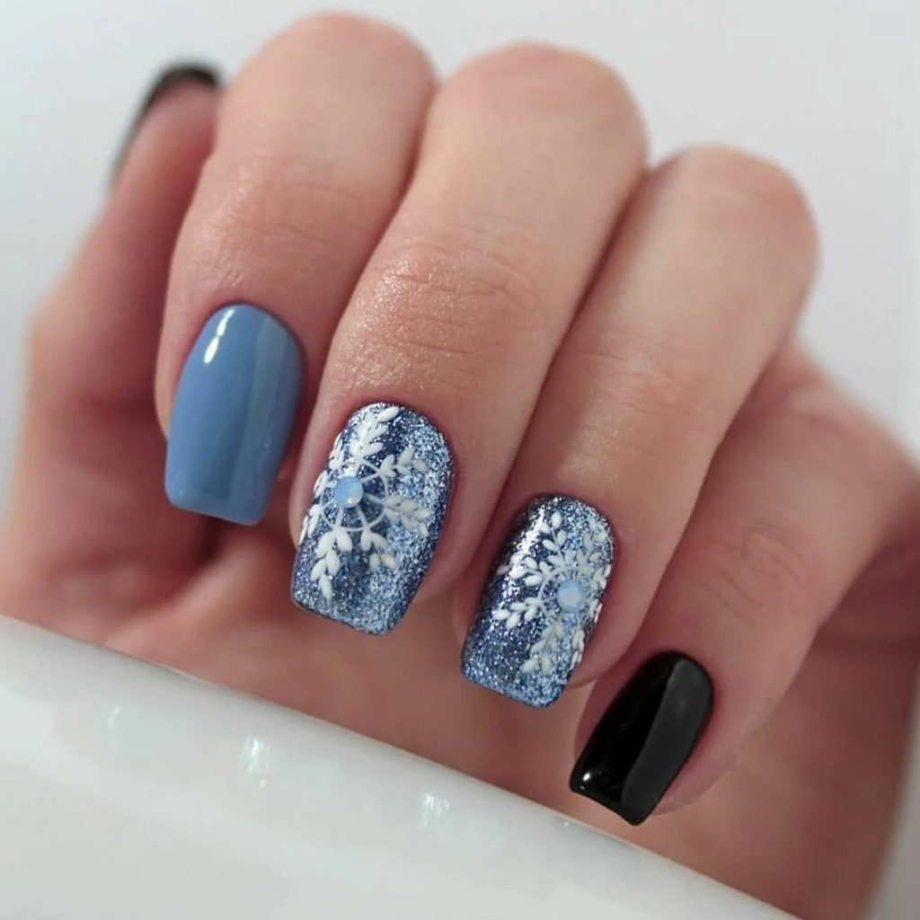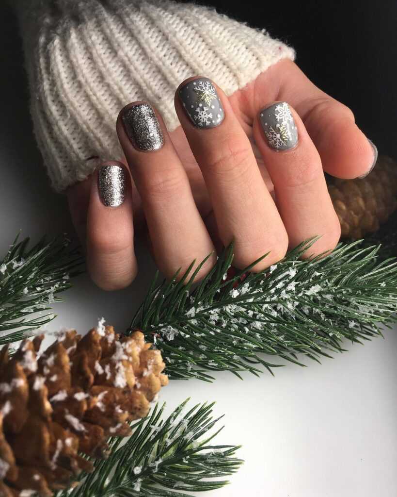 Это время года мы проводим в предвкушении Нового года и сопутствующих ему праздников. Зимние и рождественские мотивы – отличная идея украсить ногти и улучшить свое зимнее настроение. Хорошо смотрятся блестки и фольга, стразы и конфетти, наклейки в виде снежинок. Не скупитесь на фантазию, декорируя свои ноготочки. Кстати, их можно оформить в виде ёлочных игрушек.