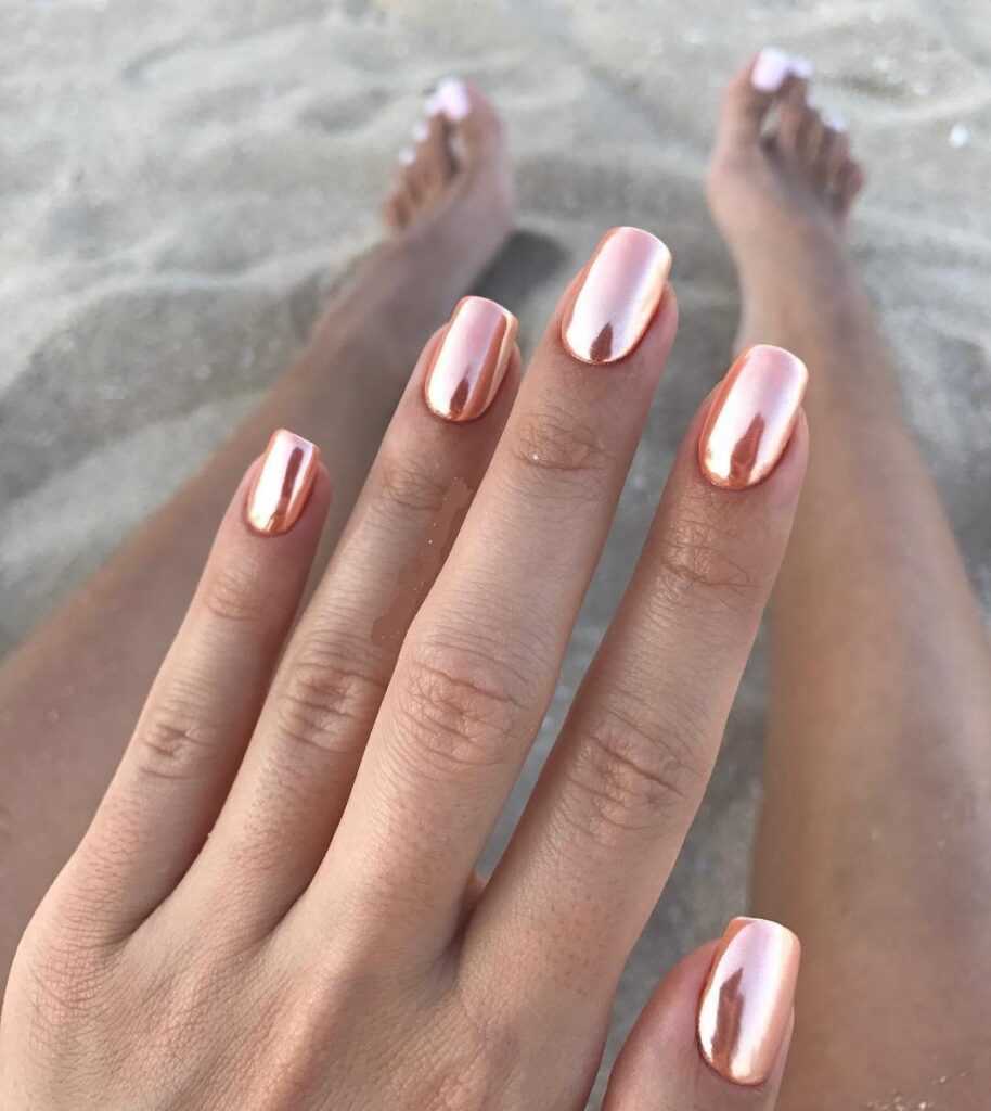 Наступление лета совсем не повод отказываться от красивого маникюра с использованием всевозможных металлических оттенков. Выбирайте, что вам больше по вкусу: золото, серебро, медь? Может быть, вы предпочитаете изысканные скромные акценты, не вызывающе блестящие, а лишь скромно мерцающие. Тогда декорирование блестками, частичками фольги или декоративной лентой это ваши варианты.