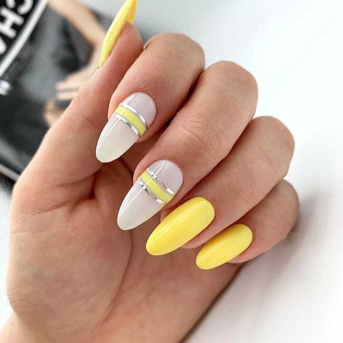 Желтый цвет отлично смотрится в классическом френче и лунном дизайне ногтей, с оттиском фольгой. Лучшим дополнением желтого цвета станет белый. Такое сочетание оттенков позволяет создать сдержанный и женственный дизайн ногтей, который гармонично впишется в повседневный образ. Желтый цвет также интересно выглядит при сочетании с фиолетовым цветом. Такой маникюр не останется без внимания, так как оба цвета хорошо заметны на ногтях.