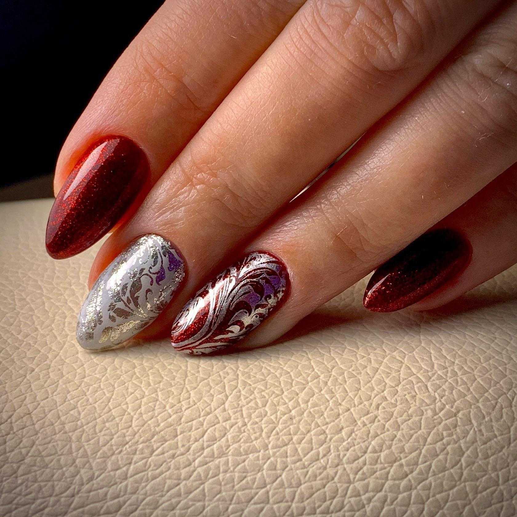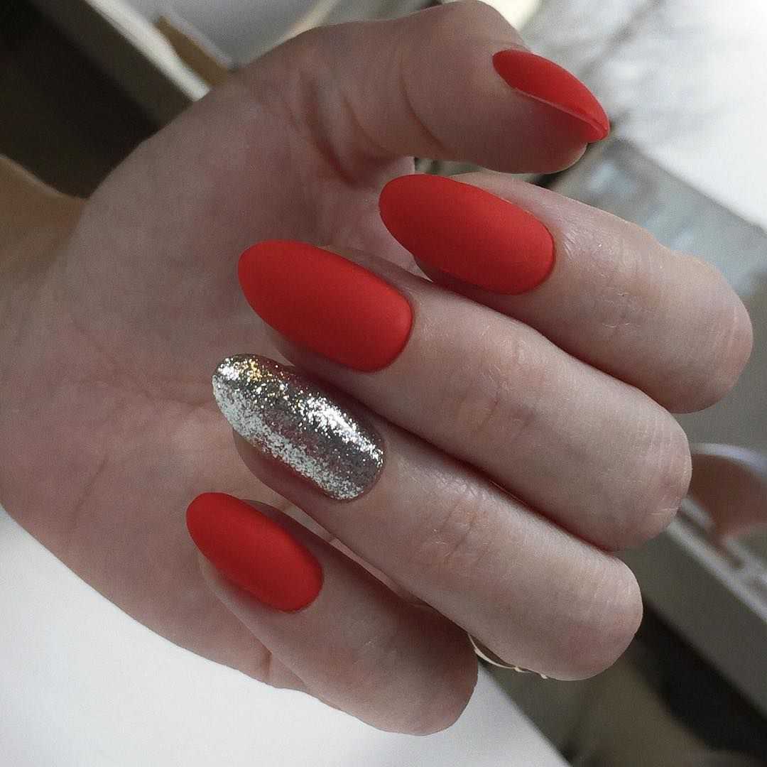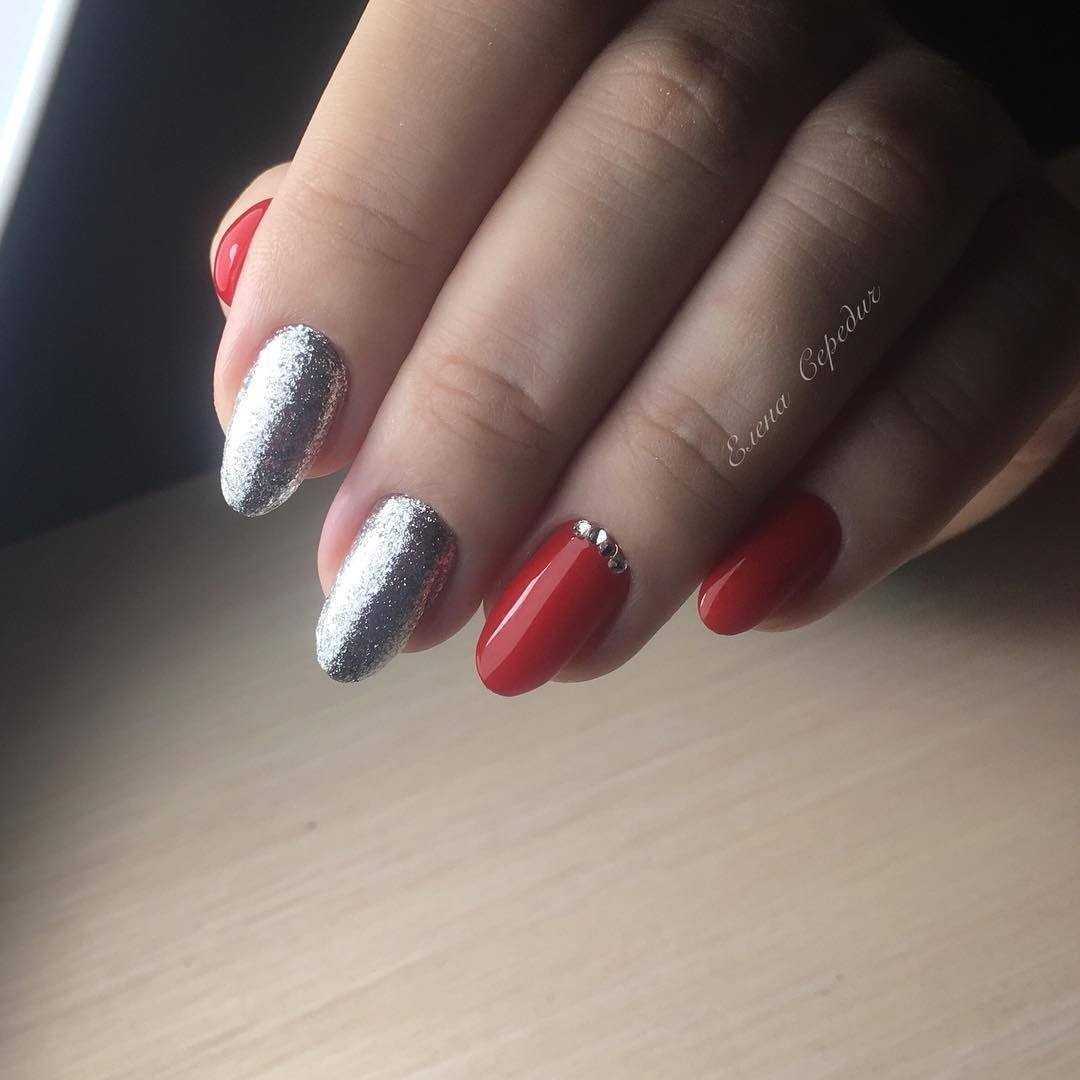 Для вечернего мероприятия лучше остановиться на сочетании красного с блестками. Ногтевые пластины покрываются багряным или тёмно-красным лаком. После этого можно перекрыть лак блестящим пигментом в полной или частичной мере.